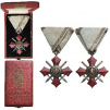Knight's Cross, 5th Class, 1st Model. Breast Badge, 54x50 mm, Silver, central medallion enameled, original suspension ring and ribbon, in case of issue, with gilt monogram of Tsar Ferdinand I and inscription on the lid. Extremely fine condition and best quality! I