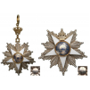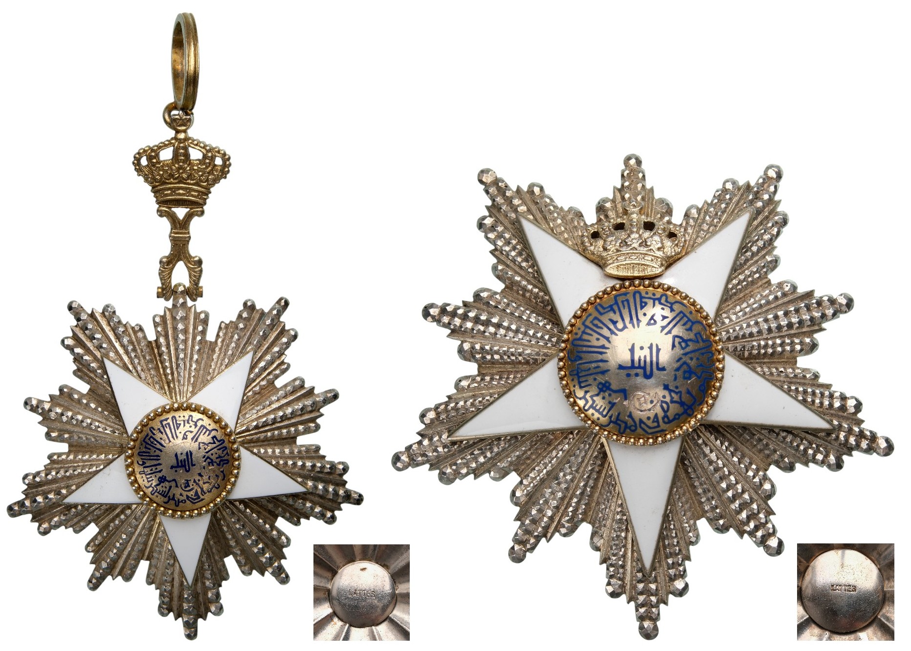 Grand Cross Set, 1st Class, instituted in 1915. Sash Badge, 93x63 mm, partially gilt Silver, enameled, superimposed part gilt enameled, maker`s mark "Lattes", with original gilt suspension crown and ring. Breast Star, 80 mm, partially gilt Silver, maker`s mark "Lattes", superimposed parts enameled, reverse with long vertical pin and two side hooks. A beautiful set, in mint condition! I