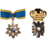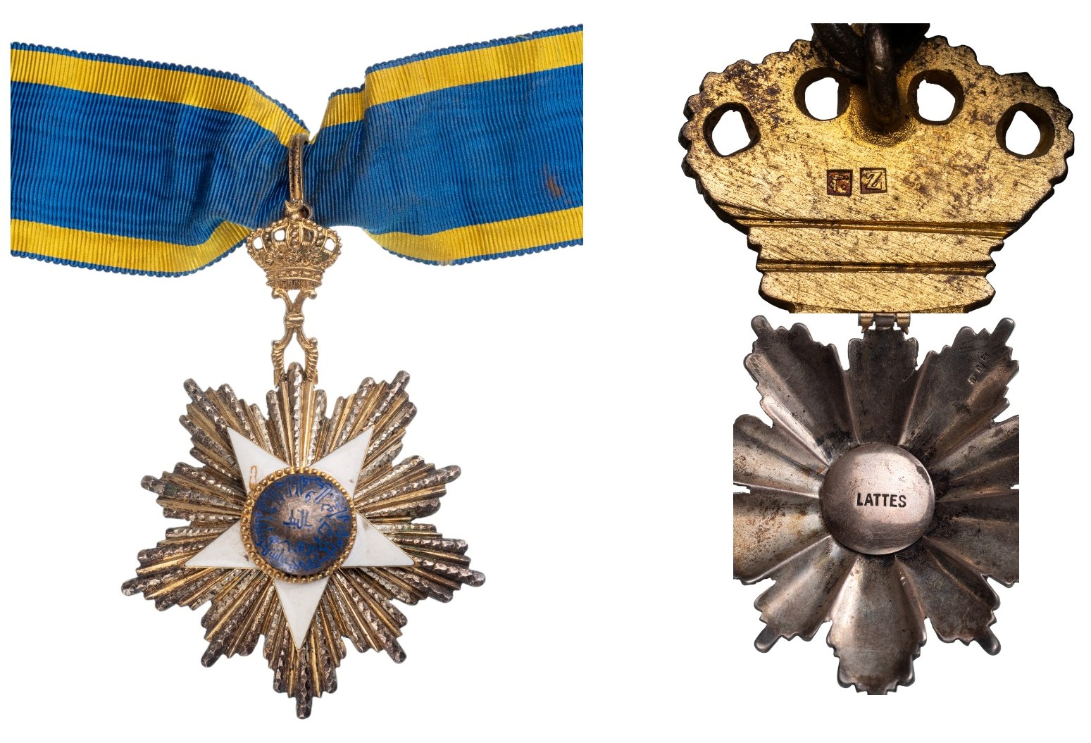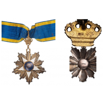 Commander's Cross, 3rd Class. Neck Badge, 89x62 mm., Silver, maker's mark "Lattes", one side enameled, central medallion gilt, enameled, original gilt suspension crown, loop and ribbon. Extremely fine condition! I