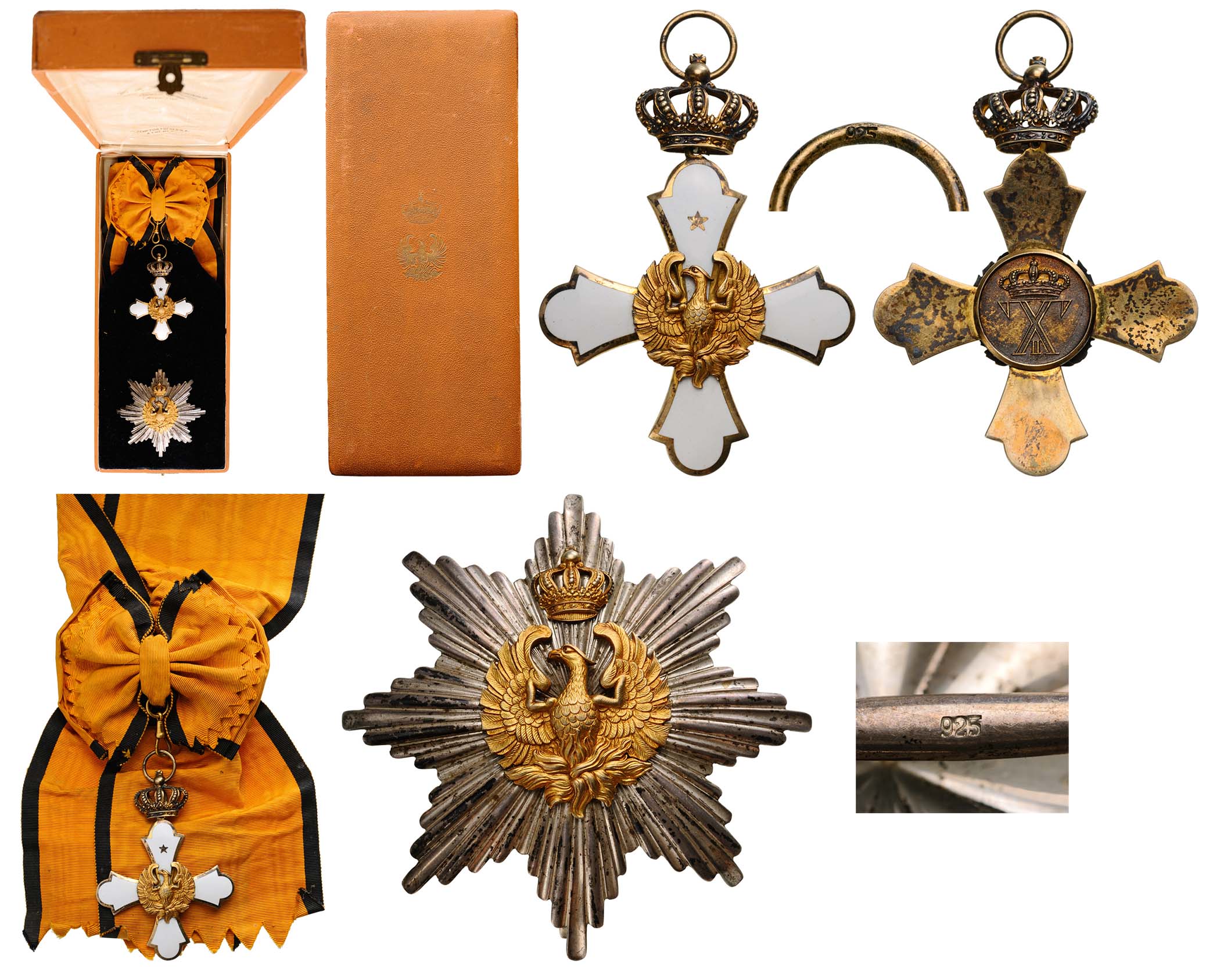 Grand Cross Set of the 2nd Type, 81x59 mm, gilt Silver, white enameled badge, centre medallion with the frosted-finishes, gilt phoenix rising from the flames, reverse medallion with royal monogram of King George II from 1936), upper loop and royal crown suspension and circular ring; original full length sash with bow. Breast Star, 82 mm, with smooth, convex and concave rays, gilt phoenix, the top ray with a gilt, royal crown; the reverse with rivets, broad pin (hallmark "925") and two side hooks; in the original, orange case of issue with the Phoenix embossed in gold on the lid, maker`s mark of Zimmermann, Pforzheim and of P. Zenetos Freres, Athens, printed on the inner cushion. An very rare group of finest manufacture; very fine condition. I RR!