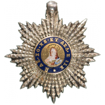 Grand Cross Miniature Breast Star, 10 mm, with chiseled rays, retaining a fine, smooth patina, centre medallion gilt with portrait of Christ in enamel miniature painting (some damages), with round suspension ring. A rare miniature! II R!