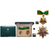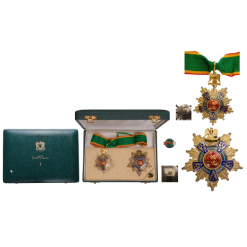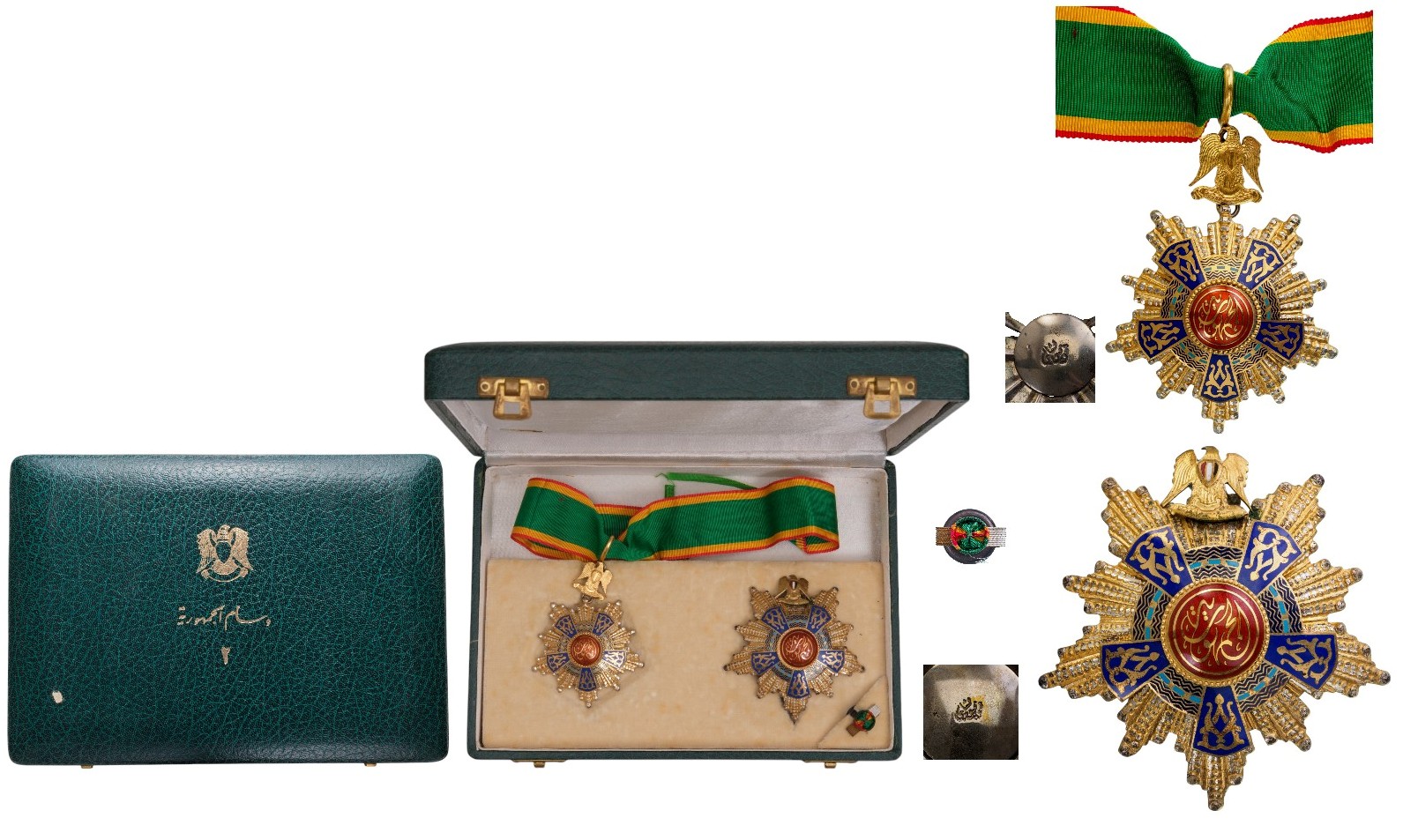 Grand Officer's Set, 2nd Class, 2nd Model (1958 -), instituted in 1953. Neck Badge, 83x63 mm, partially gilt Silver, hallmarked, Arabic maker`s mark, enameled, superimposed part gilt enameled, with original suspension device, ring and ribbon. Breast Star, 83 mm, partially gilt Silver, hallmarked, Arabic maker`s mark, superimposed parts enameled, reverse with long vertical pin and two side hooks, in case of issue by "Bichay, Cairo", with gilt monogram on the lid and rosette. very attractive set, in superb condition. I