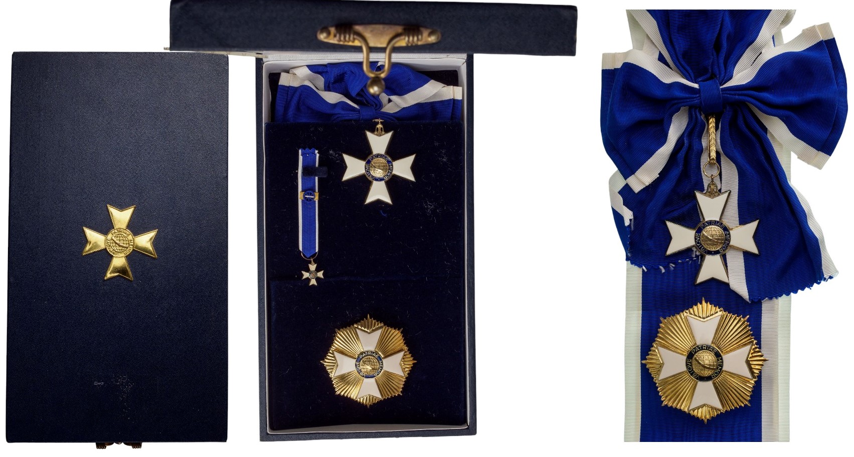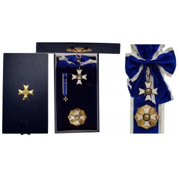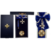 Grand Cross Set, 1st Class, instituted in 1963. Sash Badge, 73x62 mm, gilt Silver, both sides enameled, both central medallions silver gilt, obverse enameled, original suspension ring and sash. Breast Star, 80 mm, gilt Silver with smooth rays, superimposed parts gilt Silver, enameled, reverse with long vertical tapered pin, with corresponding miniature in original case of issue by "GML" with gilt order on the lid. A superb set in mint condition! I