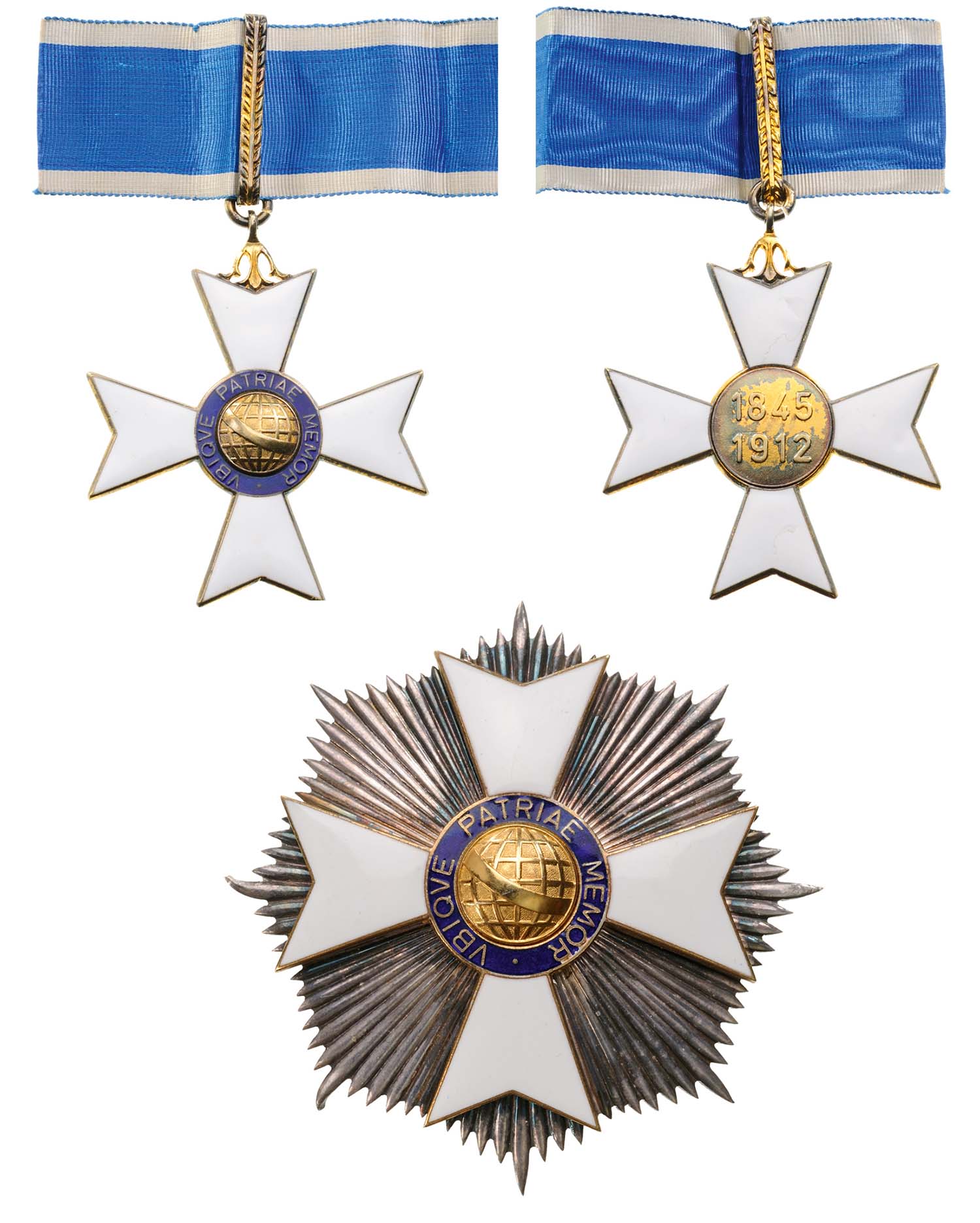 Grand Officer's Set, 2nd Class, instituted in 1963. Neck Badge, gilt Silver, 70x62 mm, enameled, original suspension loop and ribbon. Breast Star, 78 mm, gilt Silver with smooth rays, superimposed parts silver gilt, maker's mark "H. Stern", enameled, reverse with long vertical tapered pin. I