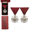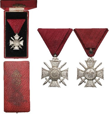 6th Class with Swords, Tsar Ferdinand I issue. Breast Badge, 45x36 mm, silvered, original suspension ring and triangular ribbon, in case of issue, with gilt monogram and inscription on the lid.. A badge in mint condition! I