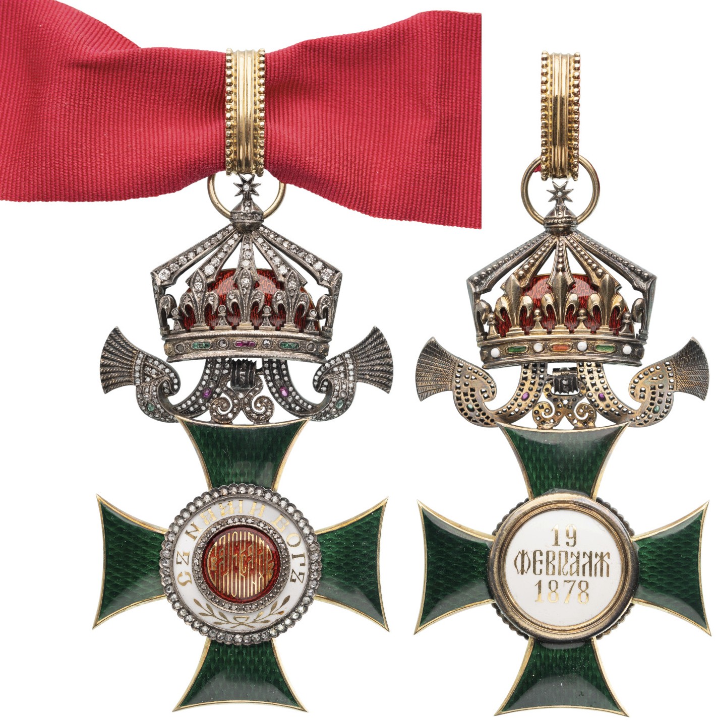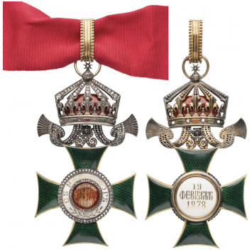 2nd Type Commander’s Cross with Diamonds. Neck Badge, 95 x 51 mm., with diamonds, GOLD and Silver, the center set with brilliants on the obverse, green enameled gold inner arms, secured in the cross’ frame by means of thin pins, visible on the highly polished rim, the center with white enameled gold border, red enameled medallion, gilt silver reverse center with white enameled medallion, silver crown with diamond set fleurs de lys and pendalia, enameled details and inner cap, cross’s and crown’s pendalia’s reverse with accurate ajour work, ribbon ring, original, crimson silk neck ribbon.