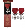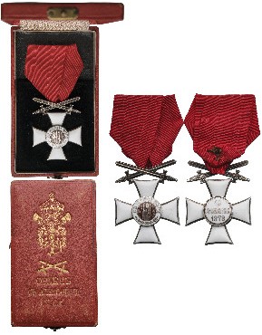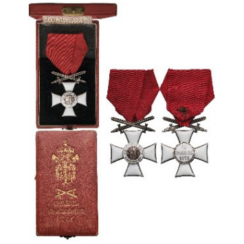 Knight's Cross Military, 3rd Model, 2nd Type, 1918 - 1943. Breast Badge, 48x37 mm, Silver, original suspension ring and ribbon, in case of issue with gilt weapon and inscription on the lid. A badge of best quality and mint condition! I