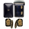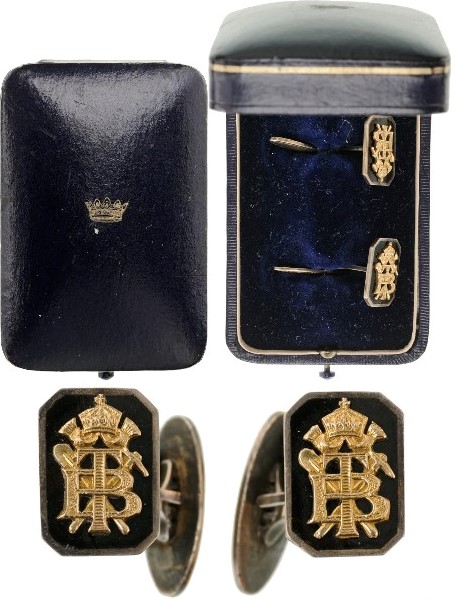 Black enameled octagons, bearing the crowned, 17x12 mm, Gold monogram “TB” with crossed shovel and pickaxe beneath, the reverse, fitted with a prong and a spring-folding oval counter-button with thin engravings and beaded border, in the original, dark blue, fitted case of issue.