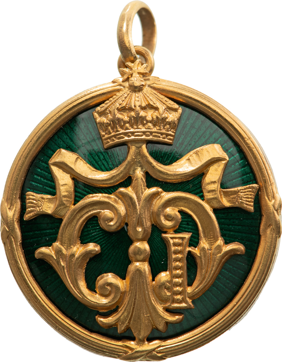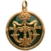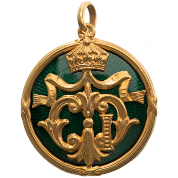 Breast Badge, 28 mm., GOLD, round medallion, the obverse with green, translucent enamel, bearing applied, golden cyrillic monogram of Tsar Ferdinand I under Bulgarian crown with long pendalia. Round loop and small suspension ring, smooth, slightly convex reverse.