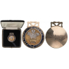 Membership Badge, 39x32 mm, GOLD, round, glazed medallion with the Prince of Wales’s arms on radiating beams, within blue enameled Garter bearing the motto “HONI SOIT QUI MAL Y PENSE” in fine, gold lettering, polished, convex reverse, with the engraved motto “ICH . DIEN”, fitted with its original suspension as a stylized bow with engraved details, in dark blue morocco case with fitted inner compartment. A beautiful, rare badge, dating from the mid-19th Century, excellent jeweler’s quality and condition. I R!