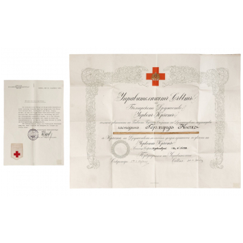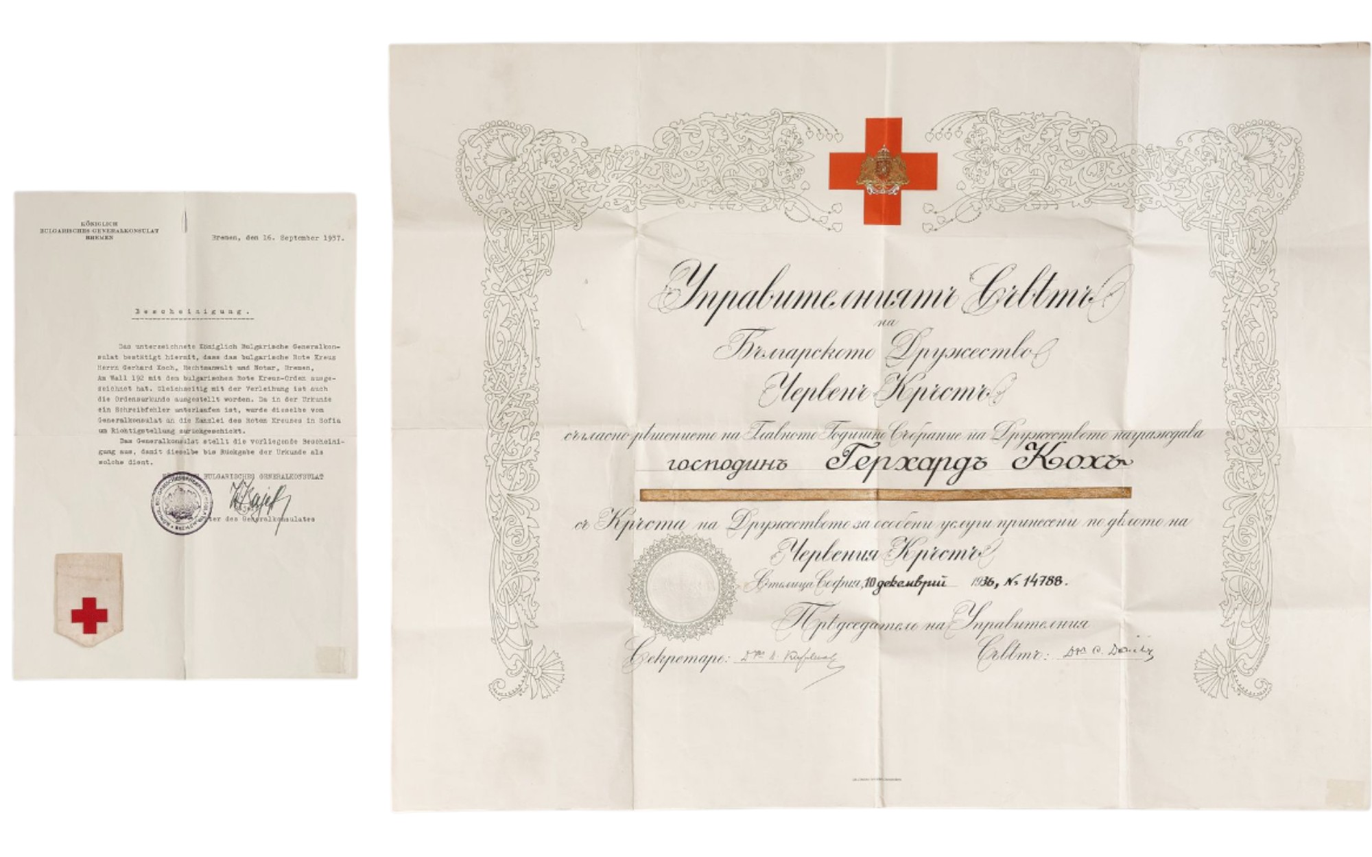 SKU: 337 The Live Auction begins in: Click here to register for the live Auction Starting price 150 EUR Log in to place a bid. Total bids: 0BULGARIAAwarding Document 59x47 mm., to Mr. Gerhard Koch, dated 1936, together with nomination letter, dated 16th of september 1937, numbered "14788".. Extremely fine condition and rare! I R! Shop ID: PM 1Auction LXX - Day 1