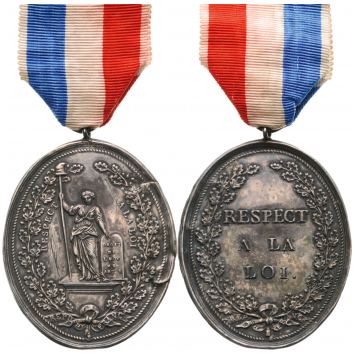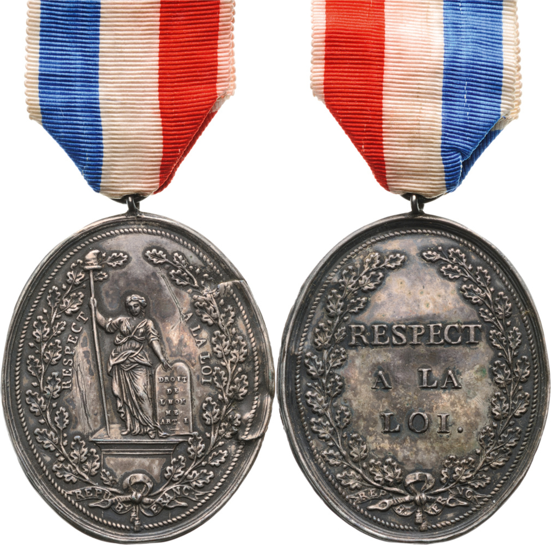 Breast Badge, 2nd Type with "Republique" and the Tablets for the Rights of Man, 53x43 mm, Silver, made in two oval sections (some damage to the obverse). Intended for the administrator of a departmen. II- R!