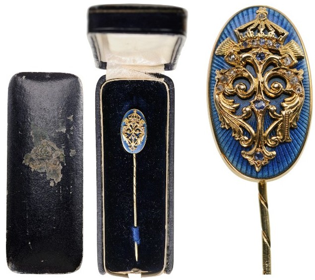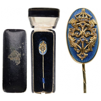 Breast Badge, 21x13 mm., intricately-made, crowned, cyrillic “F” made of GOLD, set with Diamonds and Sapphires, on a golden, oval, blue enameled base, this, fitted to the reverse with vertical, golden pin and in the original, night-blue case of issue.
