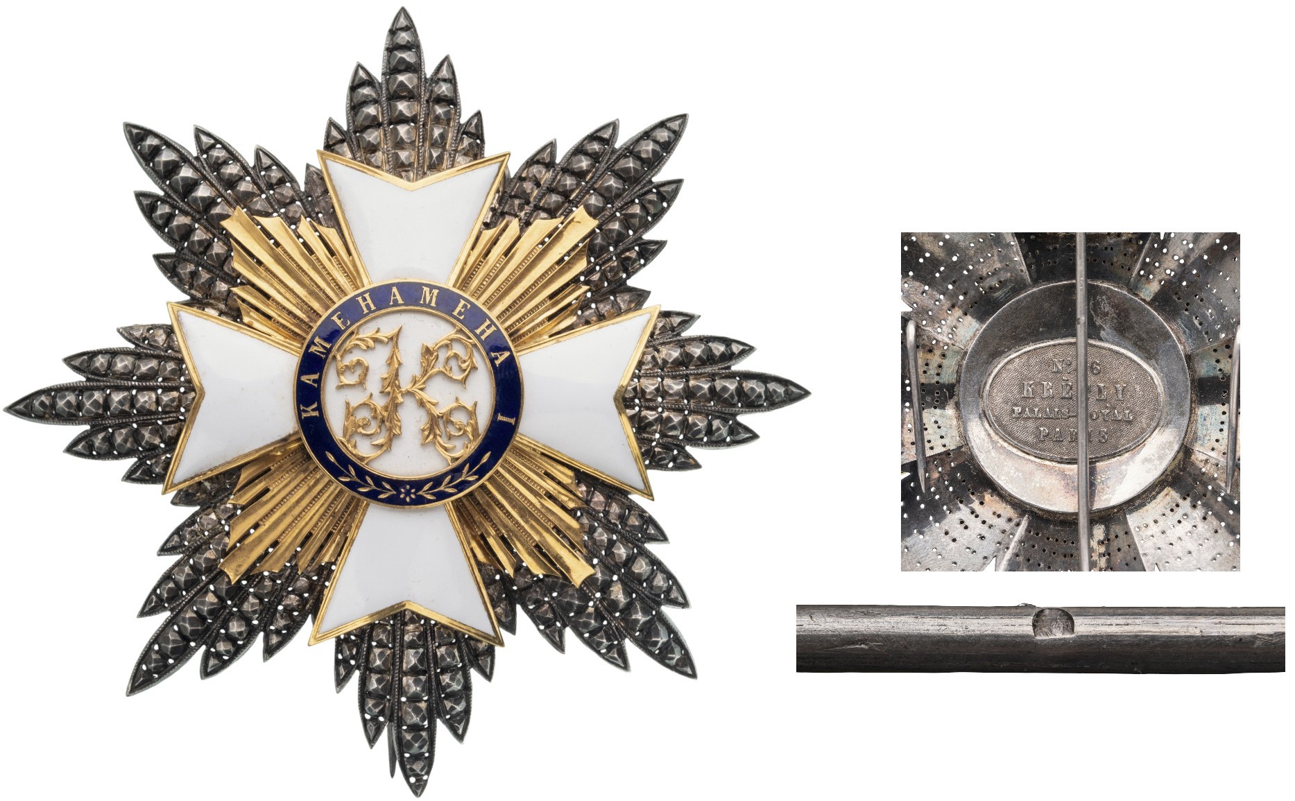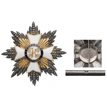 Grand Cross Star, instituted in 1865. Breast Star, 86 mm, GOLD and Silver, maker's mark "Kretly, Paris", superimposed parts gold, enameled, vertical pin and two side hooks on reverse. An extremely rare and elegant star, in mint condition! Only 10 Grand Crosses were awarded! I RR!