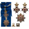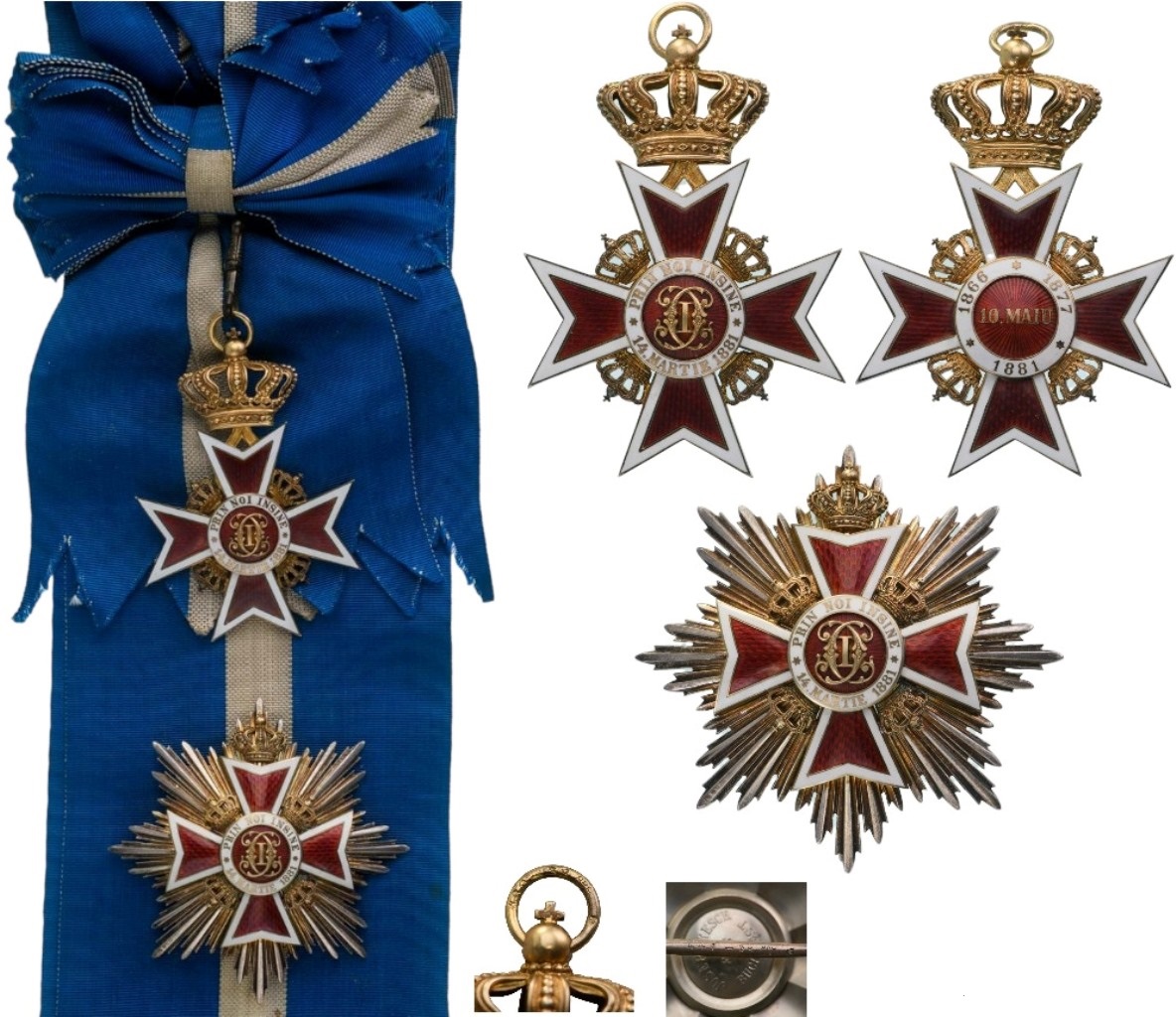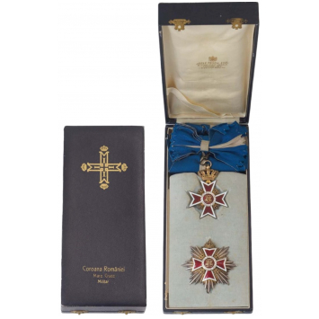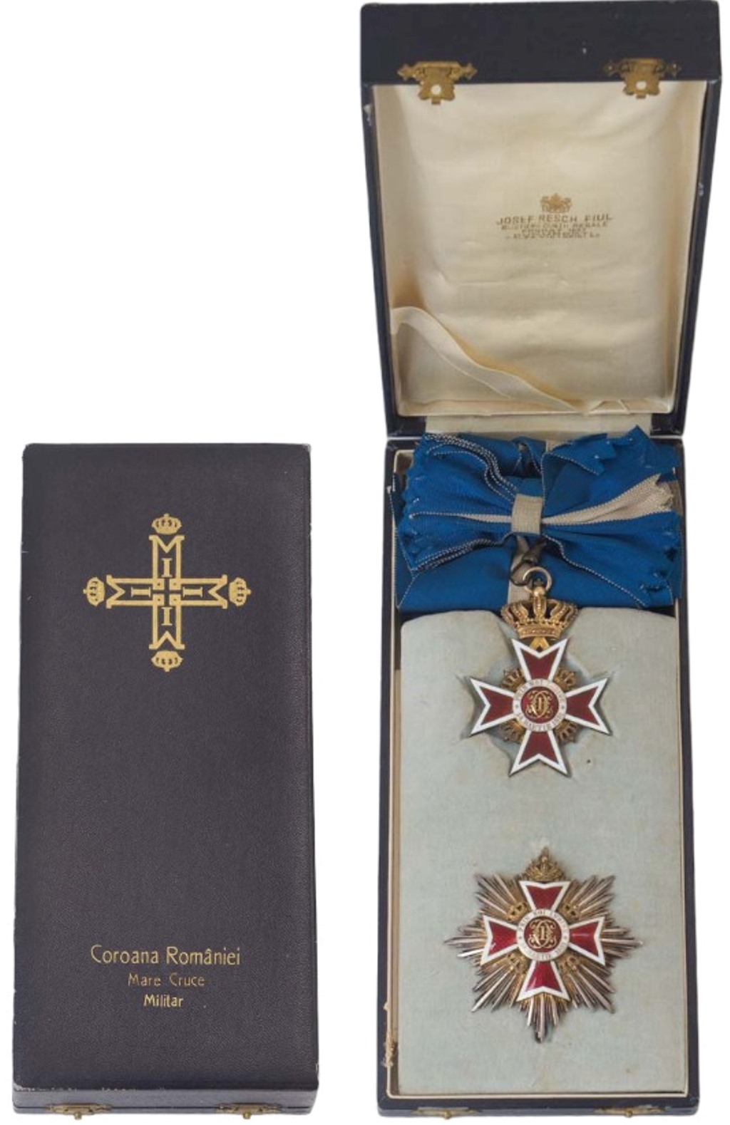 Grand Cross Set, 2nd Type (1938), Military in Time of Peace. Sash Badge, 79x55 mm., gilt Silver, hallmarked "489 - 38 - ARG - crown", both sides red enameled, original suspension crown and original sash. Breast Star, 76 mm, Silver, hallmarked, "447 - 38 - ARG - crown", maker's mark "Joseph Resch Fils, Bucarest", enameled, vertical pin on reverse, in original case of issue by "Joseph Resch Fiul, Bucuresti", with gilt monogram of Mihai I on the lid. A splendid and very rare set, of the period of Regency of King Mihai I, in mint condition! I RR!
