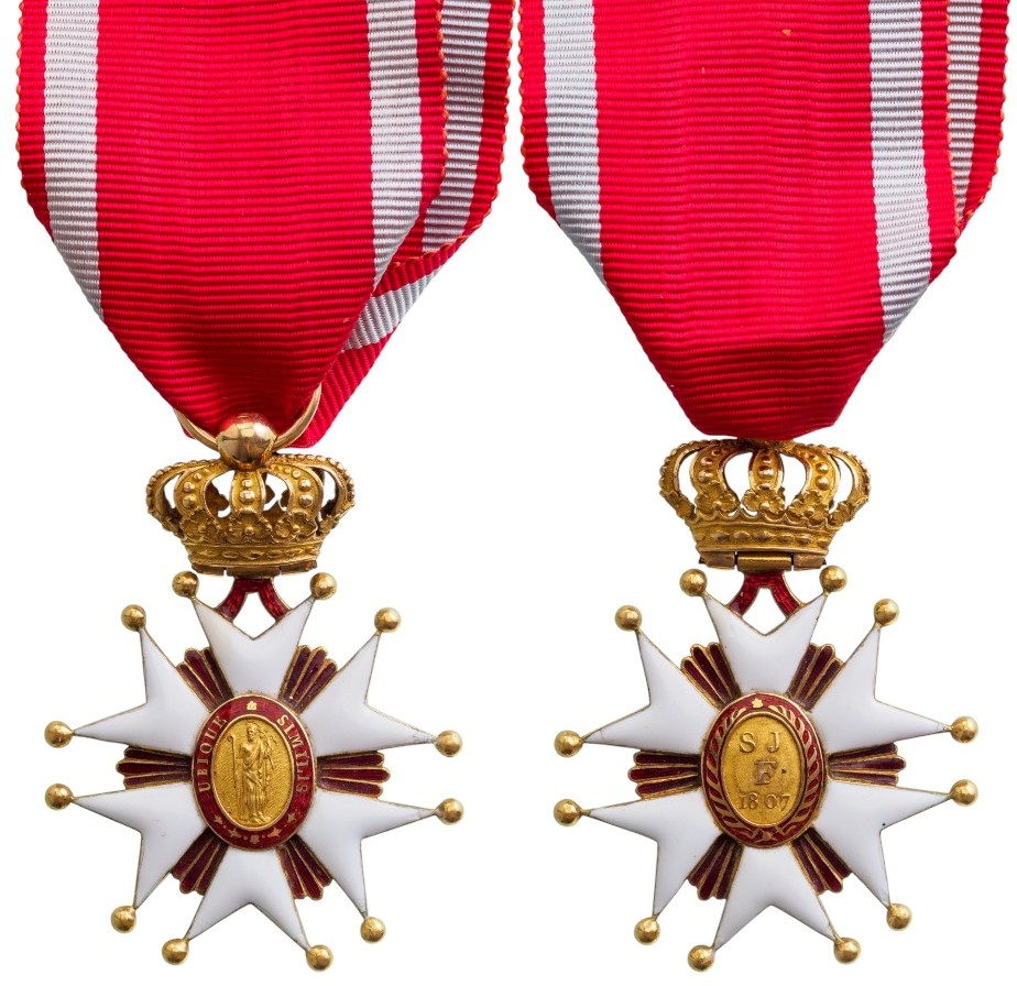 Knight's Cross, instituted in 1807. Breast Badge, 53x39 mm., GOLD, white enameled, six-armed cross with ball finials to the tips, flanked by groups of round-tipped, dark red enameled beams, oval centre medallion with the embossed image of the Saint standing on golden field within red enameled outer circlet with the golden motto “UBIQUE SIMILIS”, oval, reverse centre medallion in gold with embossed “S.J.F. 1807” on finely pebbled ground, within red enameled outer circlet with stylized, golden laurel wreath, red enameled upper loop to which the Grand Ducal crown is hinged, round suspension ring and original ribbon. A superb 19th century cross, in exceptionnal condition! Beautiful and rare! I R!