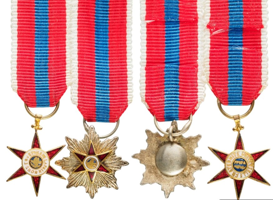 Grand Officer's Set Miniatures. Breast Badge, 17x15 mm, gilt Bronze, both sides enameled, original suspension trophee, ring and ribbon. Breast Star, 16 mm, silvered, superimposed part enameled, original suspension ring and ribbon. A beautiful rare set, in mint condition! I R!