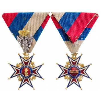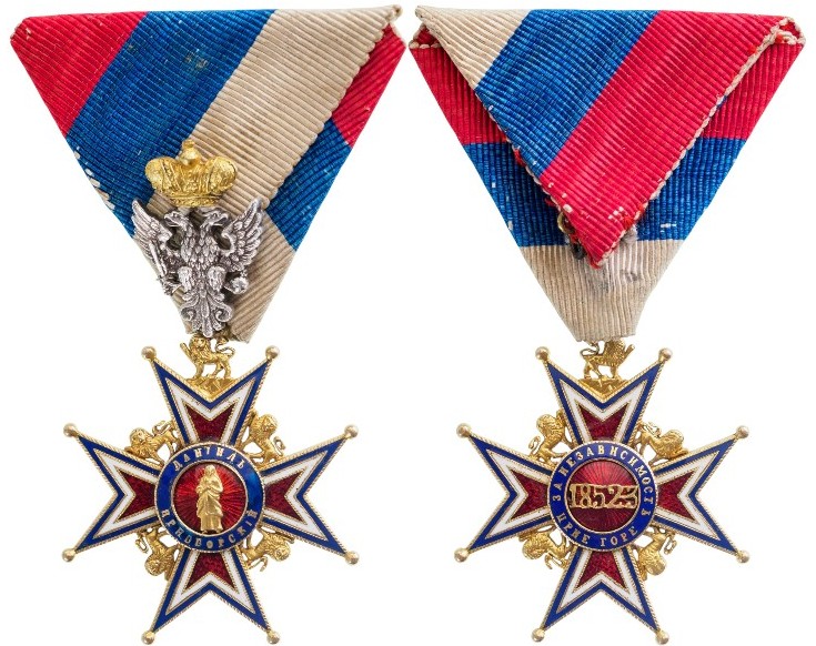 Cross of the Order, GOLD, 68,0 x 39,0 mm., with ball-finials, the arms with red enamel, bordered in white and blue, flanked by golden lions passant, red enameled obverse centre medallion, bearing the golden, standing image of St. Peter of Cetinje (the Saint Patron of the Orthodox church of Montenegro), within blue enameled outer circlet with the cyrillic inscription, meaning "DANIL I OF MONTENEGRO", red enameled reverse centre medallion, bearing the golden date "1852-3", blue enameled centre medallion with the golden, cyrillic inscription meaning "FOR THE INDEPENDENCE OF MONTENEGRO", the upper arm with golden lion passant on a stylized rock, surmounted by linked, silver Montenegrinian double eagle crowned in gold, the upper loop, struck with maker'smark, complete with original, triangular ribbon. A most rare decoration of this high family order, probably founded in 1852 by Prince Danilo I. The first award ceremony took place on June 29th, 1871 when the first recipient, the Russian Tsar Aleksander II received it, perfect condition. Bibliography: "Orders, Medals and Insignia of Montenegro", 1980, Obol, w/d. I RR!