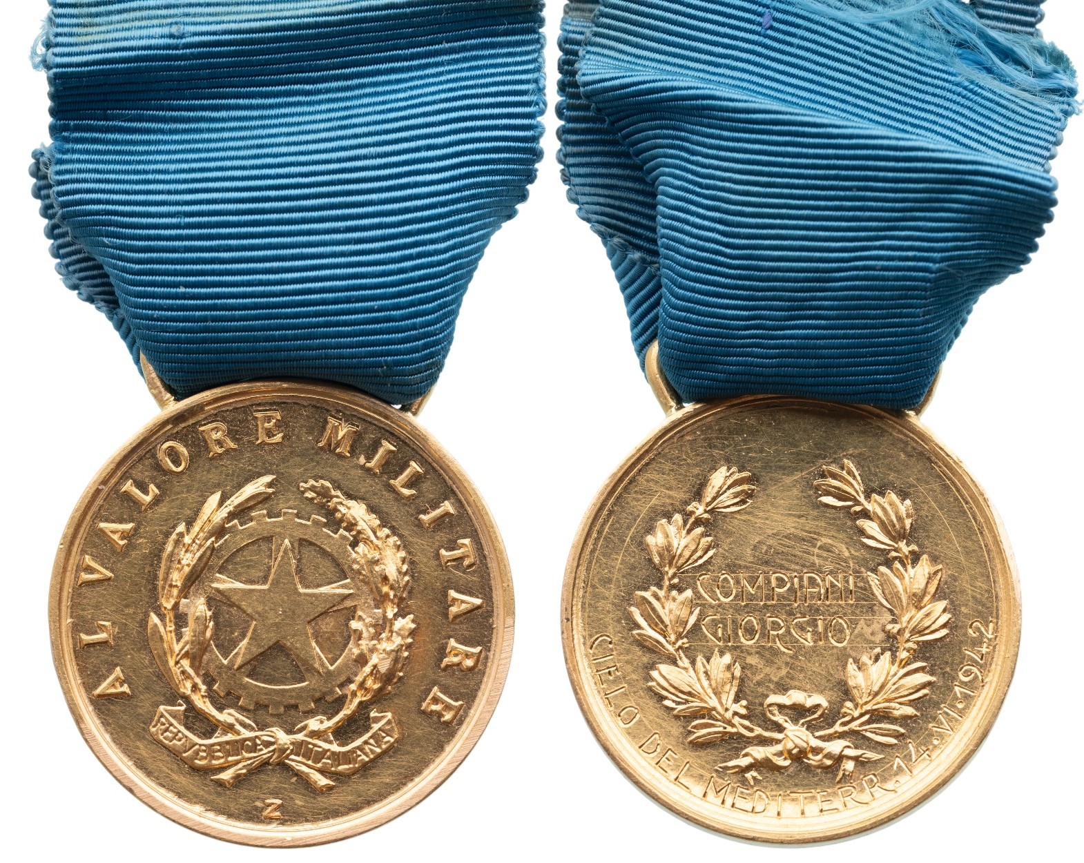 The unique and historically important, posthumous award to Pilot Sergeant-Major Giorgio Compiani; in GOLD, of the type awarded by the Republic of Italy: the obverse with the state’s coat-of-arms and, below the “Z” mark, indicating and officially-made piece, struck at the State Mint in Rome; the reverse with laurel wreath and in the field, the engraved recipient’s name “COMPIANI / GIORGIO” and around, below “CIELO DEL MEDITERR. 14. VI. 1942”; typical “stirrup” suspension and original ribbon; TOGETHER, from Compiani’s estate, a War Merit Cross, Kingdom type; a particularly fine piece, patinated bronze, with original ribbon.