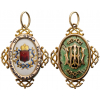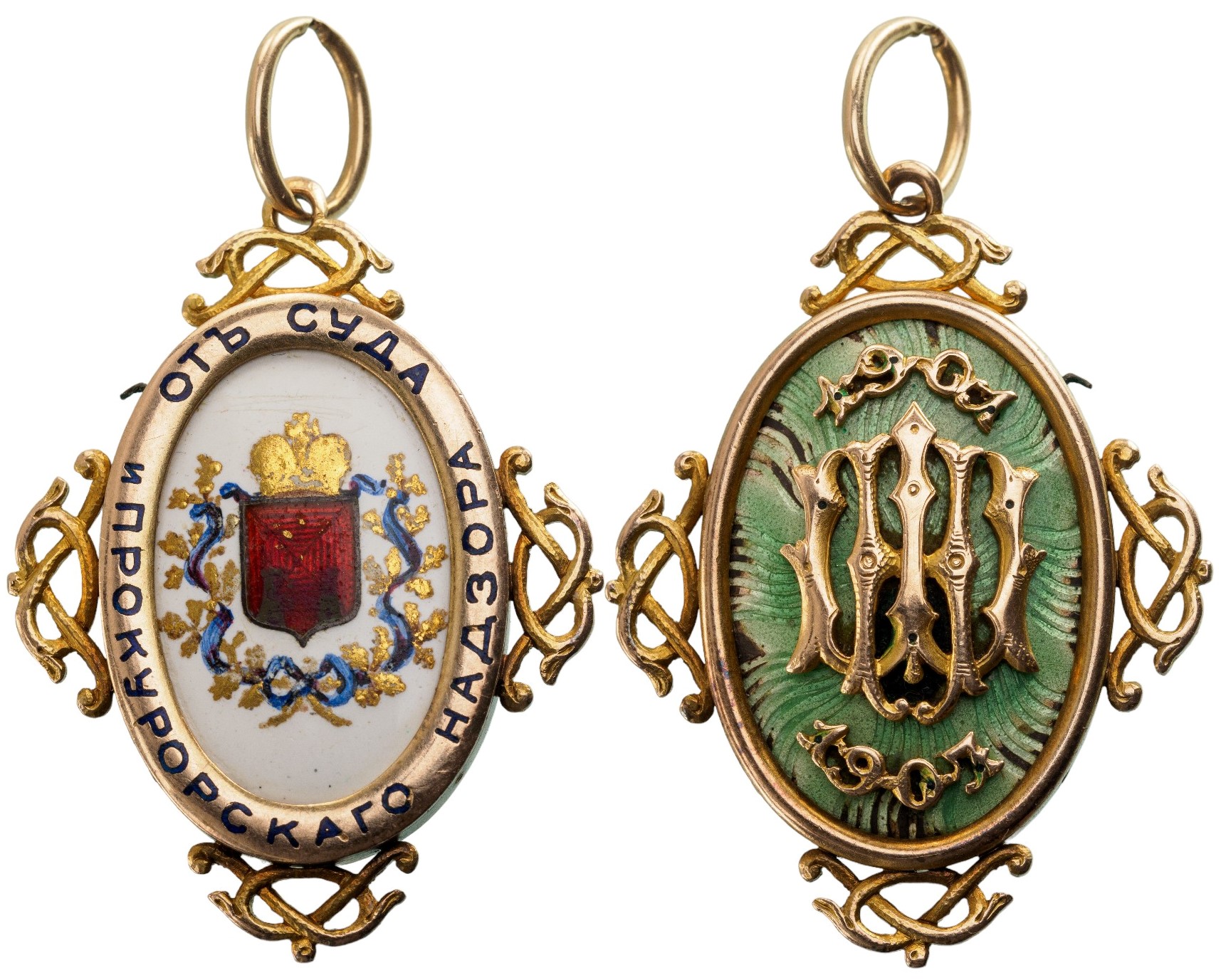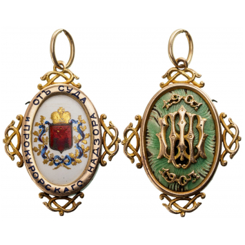 Breast Badge, 41x31 mm., GOLD, white enameled oval medallion with finely painted, crowned coat of arms within golden wreath tied by a blue riband, polished, slightly convex outer circlet, bearing the engraved and blue enamel-filled inscription “ОТ СУДА И РПОКУРОРСКАГО НАДЗОРА” (from the Supervisor of the Court and the Attorney’s Office), the whole, sided by ornamental “knots”, the upper of which, fitted with round loop and oval suspension ring, the reverse, with pale-blue enameled medallion with an attractive, beaming effect under the translucent enamel, bearing separately-made, cyrillic monogram “ШН” and the ornamented dates “1901” and “1907”.