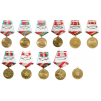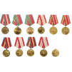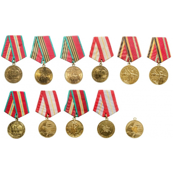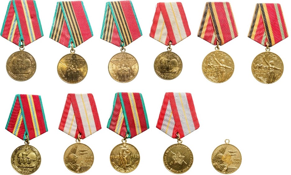 Two Jubilee Medal for 40 Years of Victory in the Great Patriotic War 1945-1985. Breast Badges, 31 mm, Brass, original suspension rings and ribbons; Two Medals for 80 Year of Soviet Armed Forces. Breast Badges, 31 mm, Brass, original suspension rings and ribbons; Jubilee Medal "Twenty Years of Victory in the Great Patriotic War 1941–1945". Breast Badge, 31 mm, Brass, obverse partially enameled, original suspension ring and ribbon with thin pin on the back; Three Medals for 60 Years of Victory in the Great Patriotic War 1945-1985. Breast Badges, 31mm, original suspension rings and ribbons (one ribbon missing) with pin on the back; Two Medals for 70 Years of Soviet Armed Forces. Breast Badge, 31 mm, Brass, original suspension rings and ribbons with pin on the back; Two 30th Anniversary of the Victory in The Patriotic War. Breast Badges, 30 mm, Brass, original suspension rings and ribbons with pin on the back. Very interesting lot! I- (11)