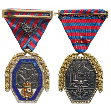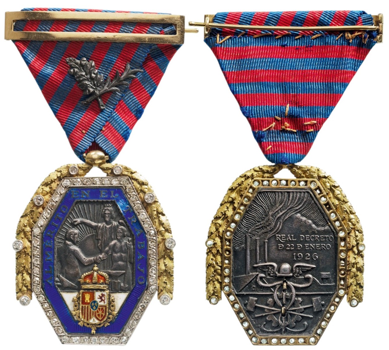 A specially-made Jeweled Piece. Breast Badge, 58x49 mm., octagonal, toned GOLD and Silver medal, the obverse with allegory of work and the rising sun, below, white enameled field and applied Spain’s coat of arms in gold and finely-done enamels, blue enameled border, bearing silver inscription “AL MERITO EN EL TRABAJO”, surrounded by diamonds and above, an oak wreath, its acorns as tiny diamonds, the reverse, also of toned gold and silver, depicting an allegory of industry and the inscription “REAL DECRETO / D 22 D ENERO / 1926”, oval loop and round ring, with original, triangular, silk ribbon, with silver, crossed oak and palm branches and fitted with Spanish-style, rectangular suspension bar in gold, fitted with hinged pin to the reverse. A beautiful medal of the reign of Alfonso XIII (1902–1931) made by a skilled jeweler as an unique present to a prominent personality, excellent condition. I RR!