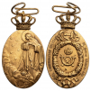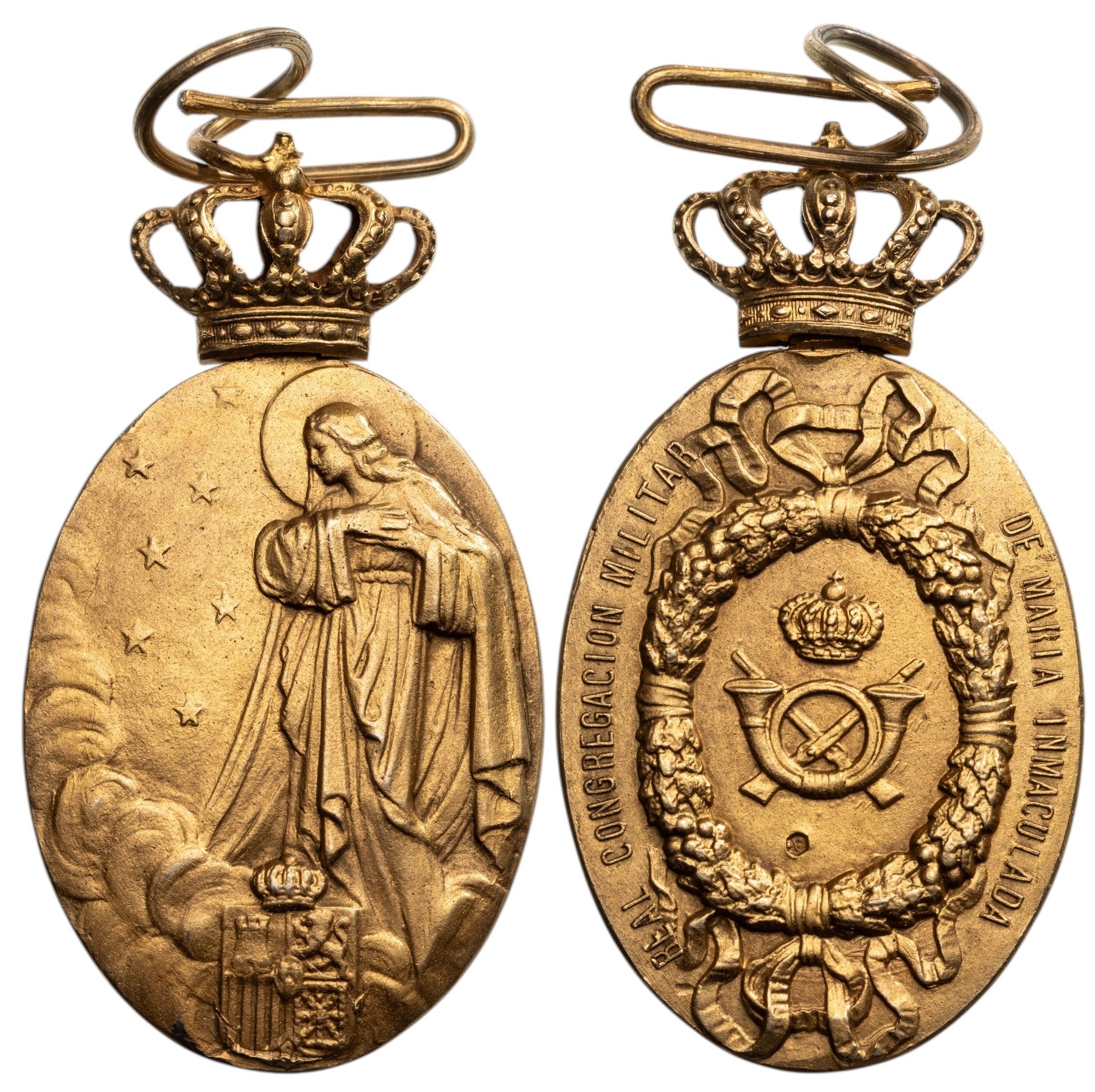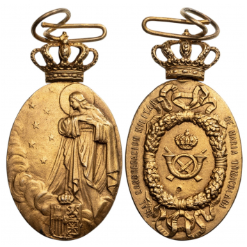 Breast Badge, 50x29 mm, with chiseled details, oval medallion with outer circlet inscription "REAL CONGREGATION MILITAR DE MARIA INMACULADA", hinged upper crown, suspension ring and further ring. A very rare badge, excellent condition and quality! I RR!