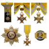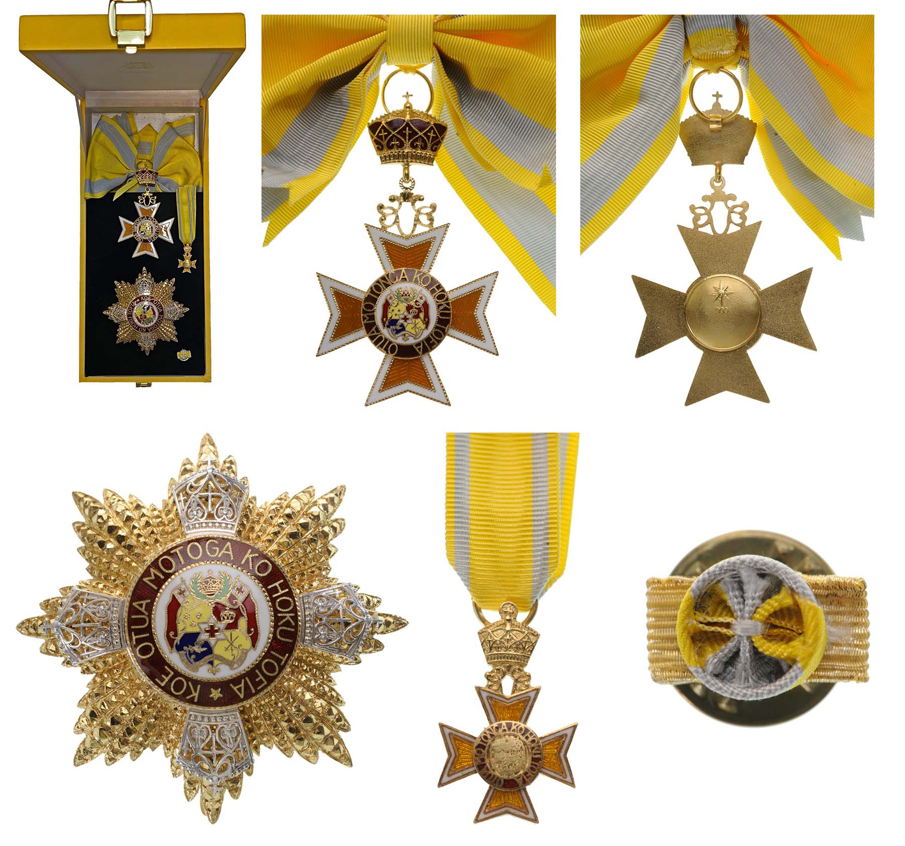 Grand Cross Set, intituted in 2009. Sash Badge, 90x55 mm, gilt Silver, hallmarked "999", obverse enameled, marker's mark "W", original long sash. Breast Star, 85 mm, gilt Silver, hallmarked "999", central medalion enameled, maker`s mark "W", vertical pin on the back, in original case of issue by "Worth International" with Tongan crown on the lid and miniature and lapel hole rosette. An extremely rare set, awarded to heads of State only, for the first time in a public saleI i RR!