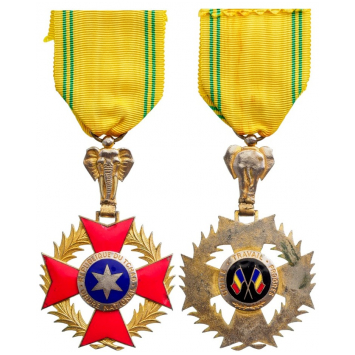 SKU: 1543 The Live Auction begins in: Click here to register for the live Auction Starting price 70 EUR Log in to place a bid. Total bids: 0TCHADKnight's Cross, instituted in 1960. Breast Badge, 48x46 mm., gilt Silver, both sides enameled, original suspension ring and ribbon. Mint state! I Shop ID: 63156Auction LXX - Day 2
