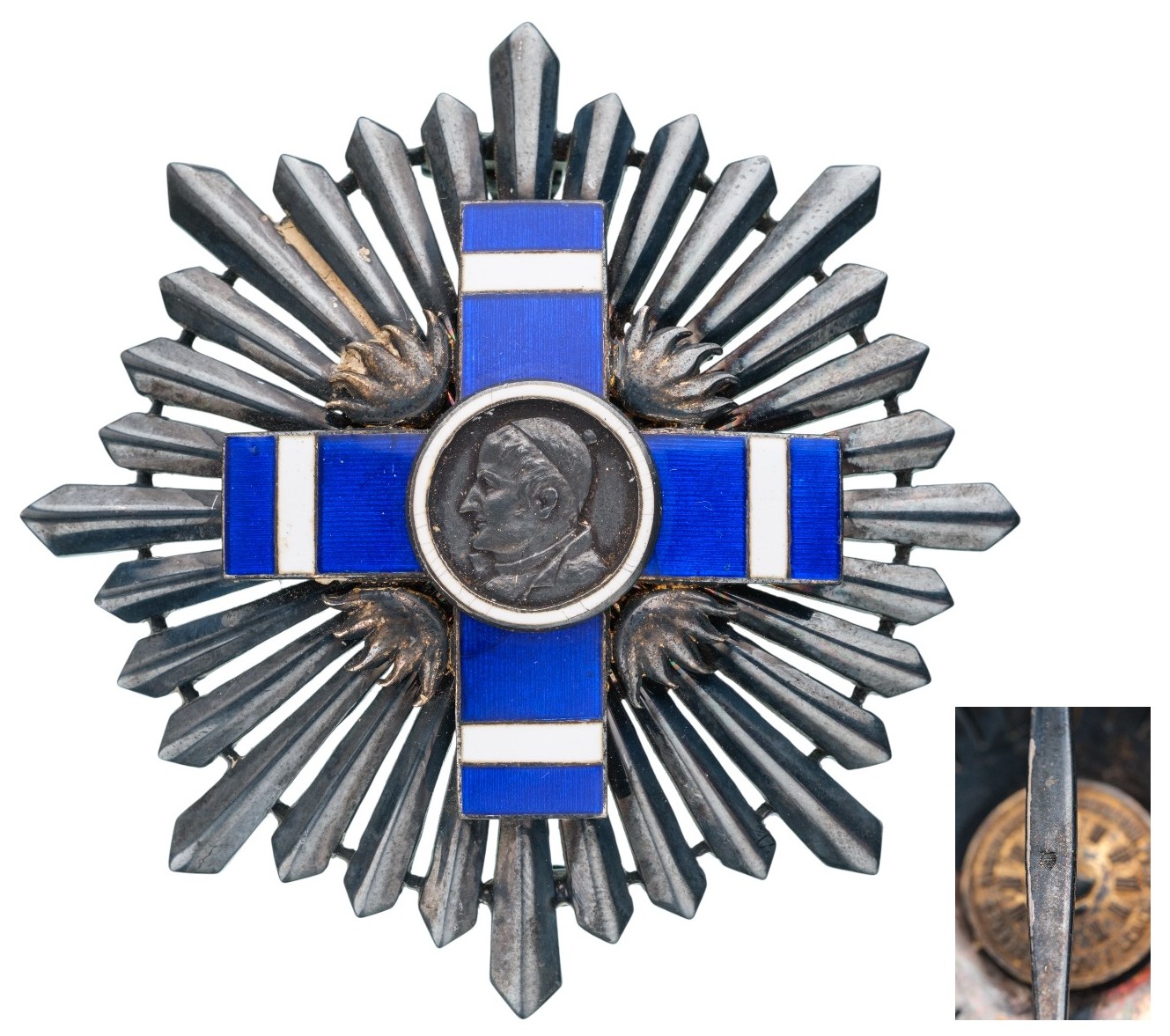 1st Class Breast Star, instituted in 1946. Breast Star, 69 mm., Silver, hallmarked "800", maker's mark, superimposed parts enameled, original medium pin on reverse. Very interesting and attractive star, of high appearance and extremely fine condition and scarce! I R!