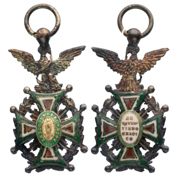 Knight's Cross Military Miniature, 5th Class, instituted in 1821. Breast Badge, 19x10 mm., Silver, both sides enameled, original suspension eagle and ring. A very rare miniature, in extremel fine condition! I-