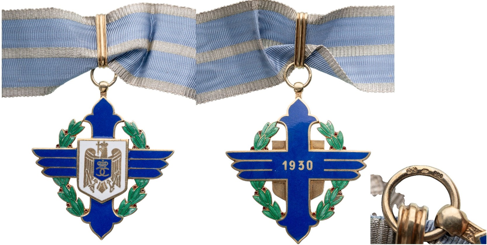 Commander`s Cross, 1st Model with cipher of King Carol II, for Civil. Neck Badge, 65x59 mm. gilt Silver, hallmarked "900", maker's mark "KK", original suspension ring, loop and ribbon. A superb and rare cross, in extremely fine condition! I R!