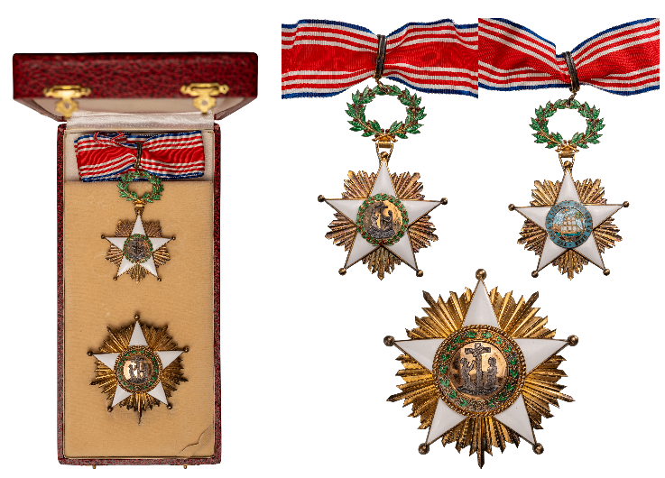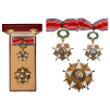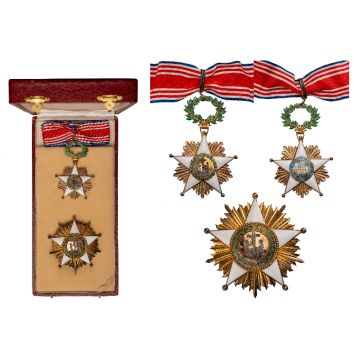 Grand Officer's Set, instituted in 1879. Neck Badge, 65x58 mm, gilt Silver, enameled, center medalion gilt Silver, original suspension wreath and ribbon with rosette, Breast Badge, 80 mm, gilt Silver, superimposed parts enameled, central medalion enameled gilt Silver, enameled, with vertical pin on the back, in case of issue by "Chobillon, Paris" . I