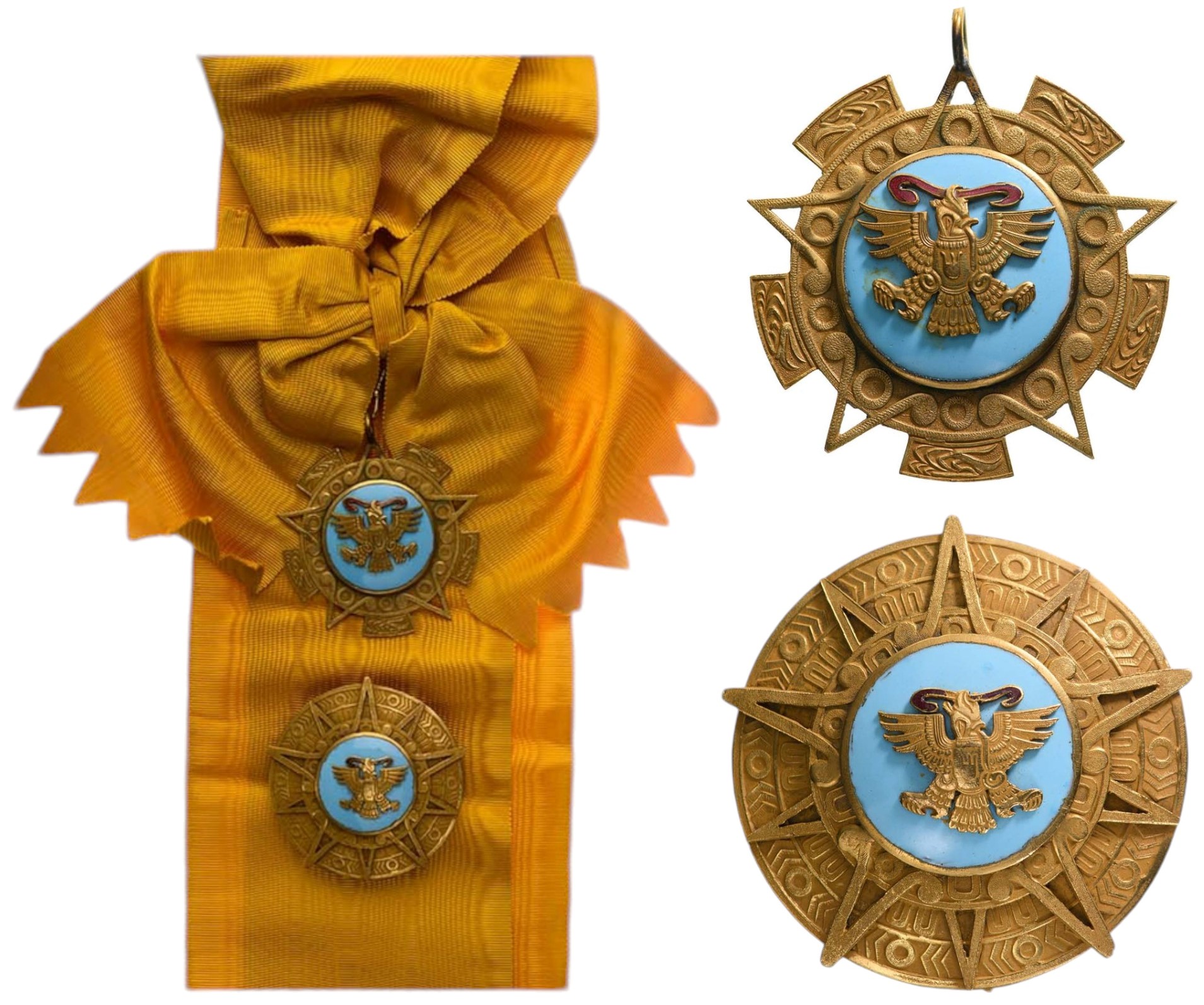 Grand Cross Set, instituted in 1933. Sash Badge, 69x62 mm, gilt Silver, one side enameled, original suspension ring and complete sash with bow. Breast Star, 58 mm, gilt Silver, one side enameled, thin pin and two side hooks on reverse. Superb set in mint condition! I