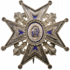 Numerary Commander’s Star. Breast Star, 59x57 mm., Silver cross flanked by fleurs-de-lys, engraved and chiselled imitating the embroidery, the arms with blue enameled details, oval centre medallion with the blue enameled monogram “C” within an oval of chiselled silver “sequines”, diamond-cut chiselled silver outer circlet, the reverse with convex counter-medallion, vertical, round pin. An attractive, curious and rare star of slightly reduced size, from the late 19th Century, extremely fine condition. I R!