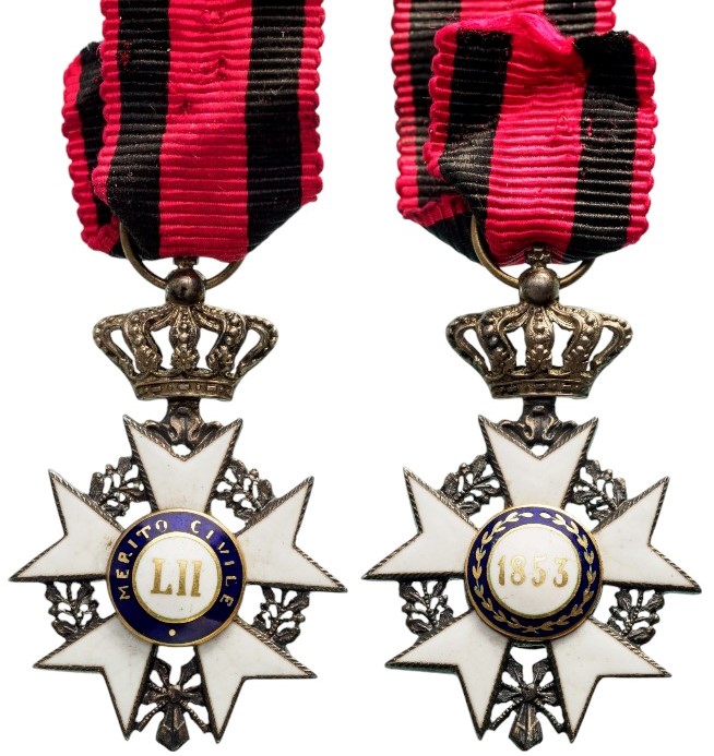 Knight's Cross, instituted in 1853. Breast Badge, 27x20 mm., Silver, both sides enameled, original suspension crown, ring and ribbon. A superb and rare large miniature, in mint condition! I R!