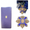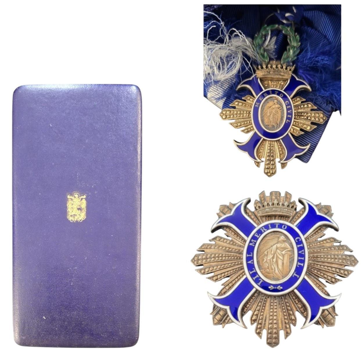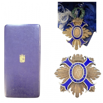 Grand Cross Set, instituted in 1926. Sash Badge, 54x48 mm, gilt Silver, enameled, obverse centre medallionwithin blue enameled outer circlet with the Order`s motto in gold lettering, green enameled, laurel wreath, suspension ring, original sash ribbon with bow. Breast Star, 75 mm, gilt Silver and separately-made, gilt arms` fields, centre medallion in the finest work, thin pin and two side hooks on reverse, in original case of issue by "Cejalvo, Madrid", with gilt weapon on the lid. Very attractive set! I