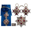 Grand Cross Set, 2nd Model, Civil. Sash Badge, 57x55 mm, Silver gilt, hallmarked "79 - HW - 37- crown", both sides red enameled, with long original sash. Breast Star, 76 mm, Silver, hallmarked "34 - 329 - crown - RS - 935" maker`s mark "HEINRICH WEISS, BUCAREST", enameled, long thin pin back. A superb set, in perfect condition! I