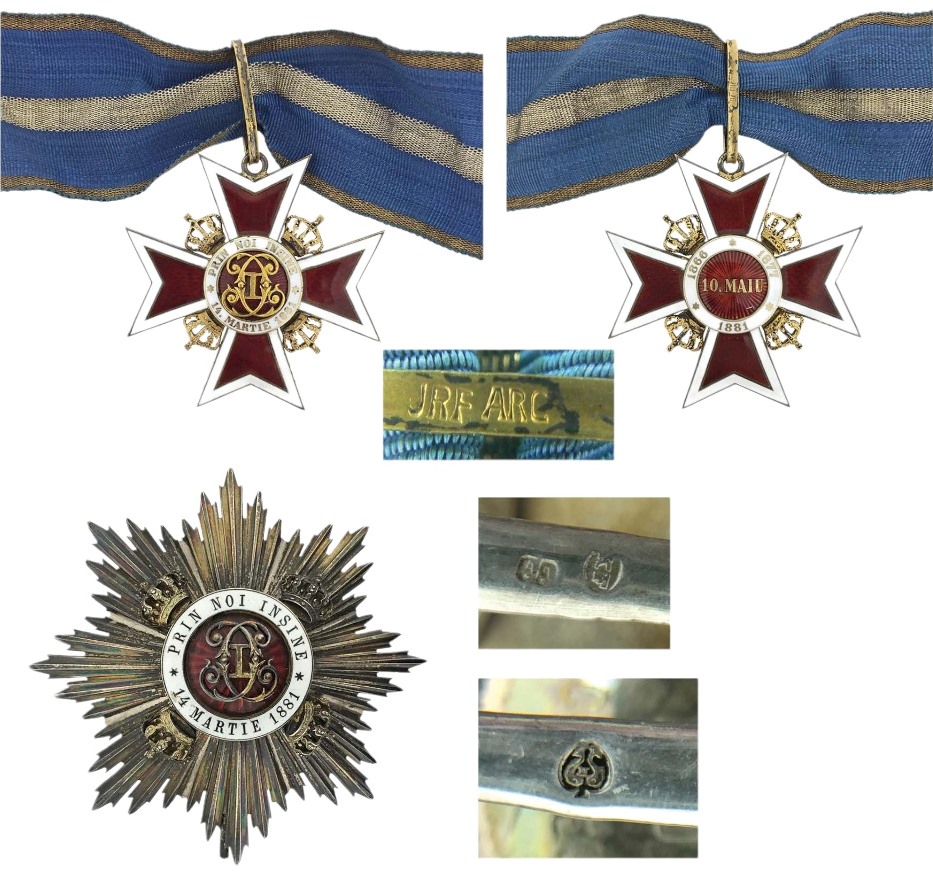 Grand Officer's Set, Intermediary Model (1932) for Civil. Neck Badge, gilt Silver, 67 mm, hallmarked "ARG", maker`s mark "JRf (Joseph Resch Fils - Bucarest)", both sides enameled, original suspension loop and ribbon; obverse medallion with cipher of Carol I, reverse with "10 Maiu". Breast Star, Silver, 82 mm, French hallmarked "AA", maker`s mark "Kf (Kretly Freres) - JRF" (Joseph Resch Fils - Bucarest), partially gilt and enamelled, brilliant cut, reverse medium pin.