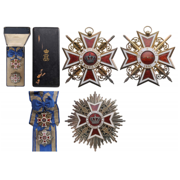 Grand Cross Set, 1st Type, MIlitary. Sash Badge, 80 mm, gilt Silver, enameled, original suspension ring and long sash. Breast Star, 85 mm, Silver, enameled with pin and two side hooks on reverse, in original case of issue by "Joseph Resch, Bucarest", with monogram of Kinf Carol I on the lid. A very rare set of French fabrication, of the highest jeweler's quality and in extremely fine condition! RR! I