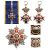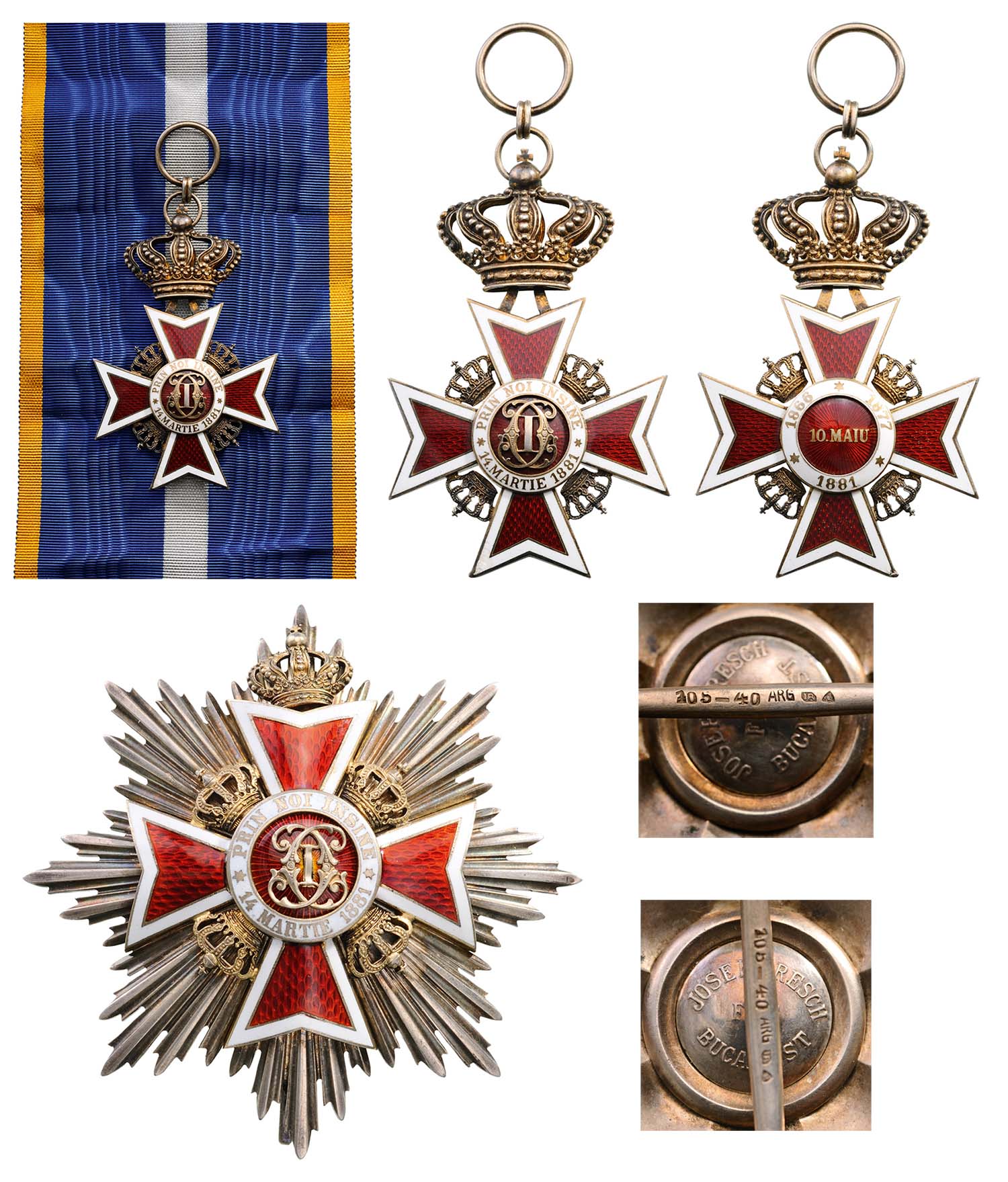 Grand Cross Set, 2nd Model (1938), for Military in Time of Peace. Sash Badge with crown, gilt Silver, both sides red enameled, short sash. Breast Star with crown, Silver, enameled, hallmarked "105-40, ARG, crown", maker`s mark "IR (Joseph Resch & Fils, Bucarest)", thin size pin on reverse. Extremely rare set of exceptional quality and superb condition. Only 50 sets awarded! Dim.: the badge, 80,0x59,0 mm; the star 74,0 mm. I RR!
