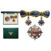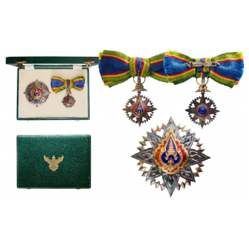Grand Officer's Set for Ladies. Neck Badge 70 x 44 mm., partially gilt Silver, original suspension in the form of the Thai crown, with original ribbon for ladies with bow. Breast Star, 81 mm, with chiseled and pierced arms, the reverse, fitted with gilt vertical pin, in the original, case of issue, the lid with gilt Thai divinity and fitted, inner compartment. A beautifully-made set, in excellent condition.I