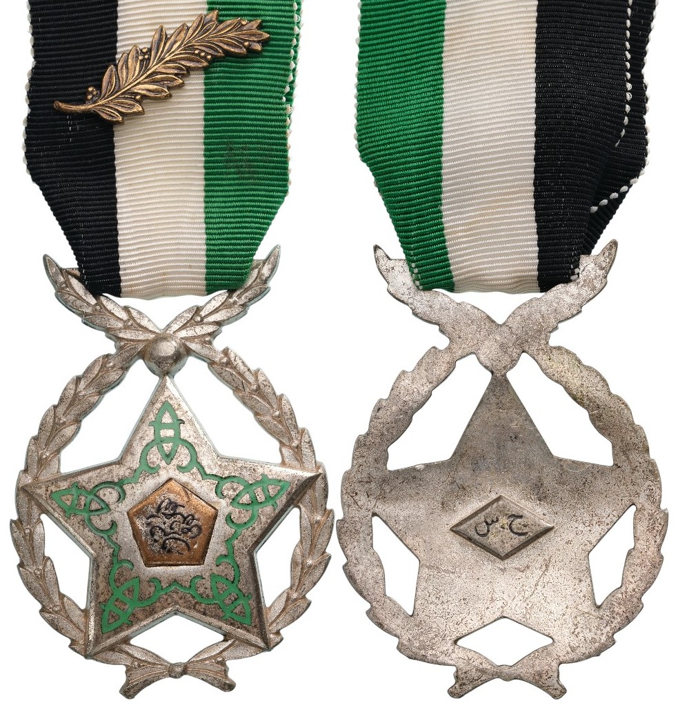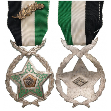 2nd Class, instituted in 1953. Breast Badge, 57x41 mm, Silver, Arabic maker's mark, one-side enameled, five-pointed, green enameled star of elaborate geometric design, surrounded by wreath, original suspension ring and ribbon with palm. Extremely fine conditionI Scarce! I R!