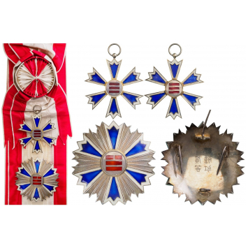 Grand Cross Set, 1st Class, instituted in 1901, obsolete in 1910. Sash Badge, 81x74 mm., Silver, both sides enameled, original suspension ring and long complete sash. Breast Star, 85 mm., Silver, superimposed parts enameled, with plain rays, the reverse with Korean inscription, broad pin and two side hooks. A superb and extremely rare set, awarded for less the 10 years, in mint condition ! I RR!
