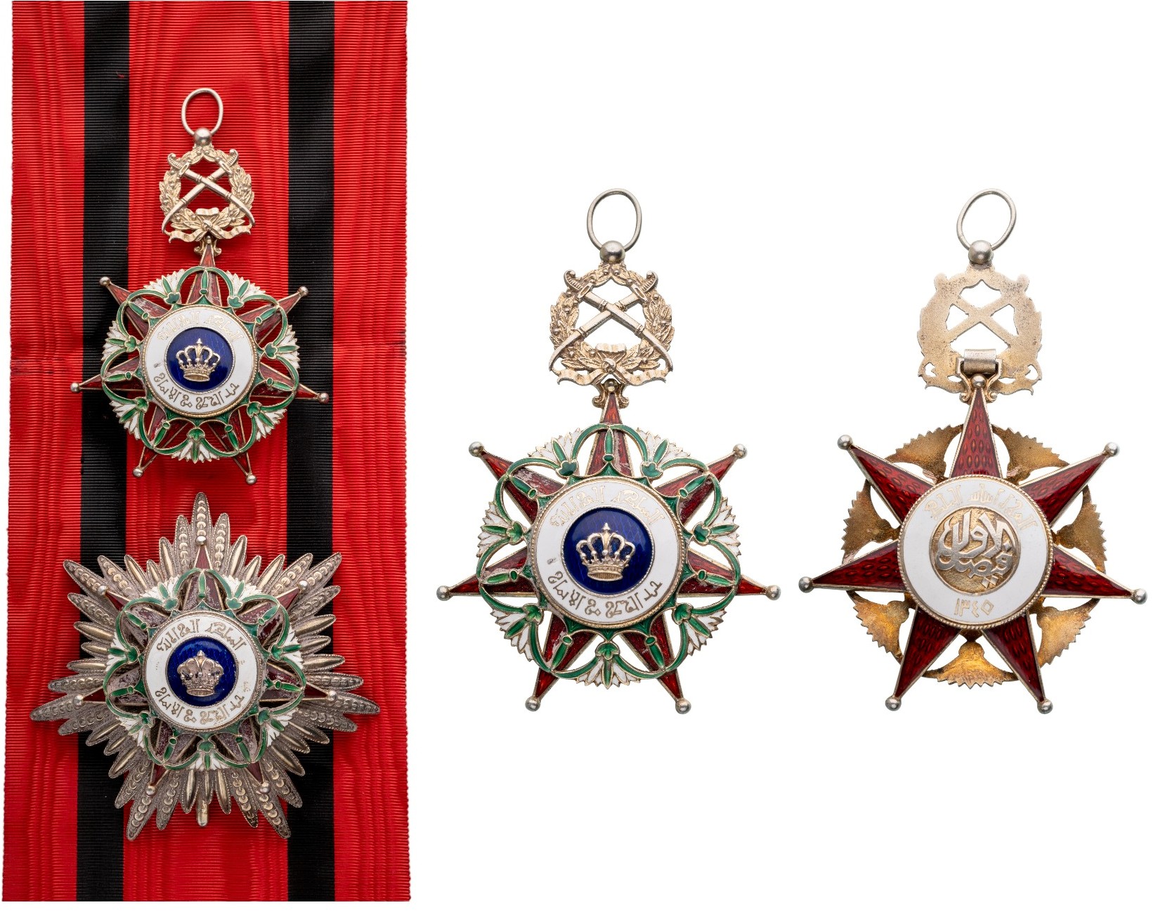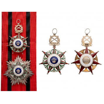 Grand Cross Set, 1st Model, instituted in 1922. Sash Badge, 91x66 mm, gilt Silver, as a red enameled star, enriched by a pattern of green/white enameled, stylized palms and lotus flowers, blue enameled centre with golden crown, within white enameled outer circlet bearing a golden, Arabic inscription, red enameled reverse, also red enameled centre medallion with complex, calligraphic inscription, within white enameled outer circlet also with Arabic inscriptions, decorated upper loop with hinged golden laurel wreath tied by a riband, round ring and original, full-length sash ribbon. Breast Star, 89 mm., Silver, the rays made with sequined pattern, alternated by smooth, polished ones, gilt silver centre, similar to the badge’s obverse, the reverse with broad pin and two side hooks.