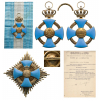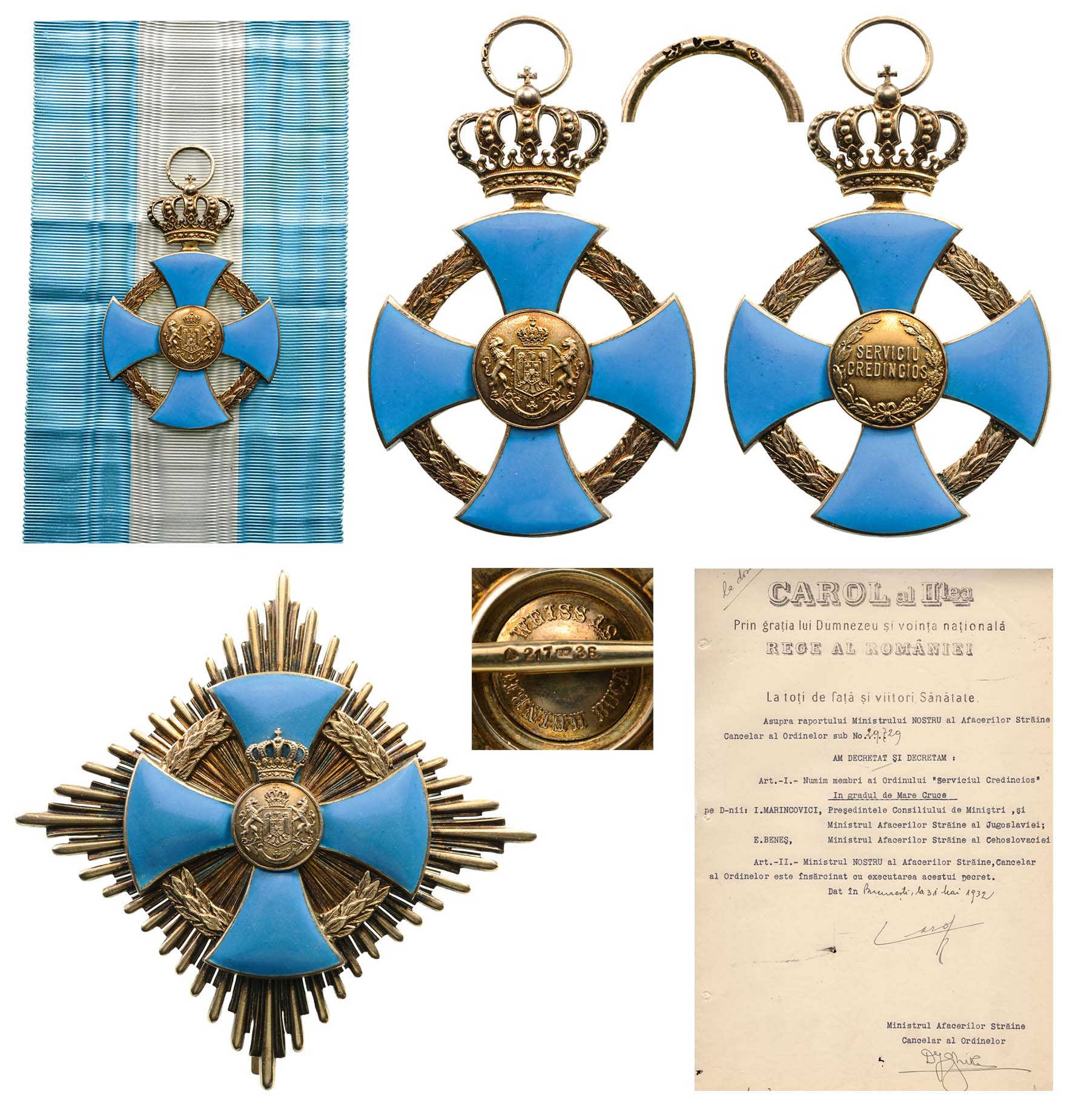 Grand Cross Set, 2nd Model Civil (1932). Sash Badge, gilt Silver, concave cross, beautifully made slightly rounded light blue enamel on both sides and laurel wreaths between the limbs. The medallion on the obverse with Romanian coat of arms, the reverse medallion with the inscription "Serviciu Credincios" (Loyal Service), hallmark and silver mark "41-43" and maker`s mark "HW", short sash. Breast star with crown above the medallion, silver enameled, maker`s mark "HW, Heinrich Weiss, Bucarest", hallmark "217-36, crown", on the reverse medium pin, together with awarding document dated 31st of May 1932, to Mr. I. Marincovici, President of the Ministers Council and Minister of Foreign Affairs of Jugoslavia and to E. Benes, Minister of Foreign Affairs, future President of Czechoslovakia, original signature of King Carol II and of Romanian Minister of Foreign Affairs Prince Ghika. The order was instituted by King Carol II on April, 29th 1932. It consists of three classes (Grand Cross, Grand Officer and Commander) and it was also intended to replace the two lower grades of the Carol I Order. In 1937 the collar and officer classes were added and the order was included among war decorations (thus awarded with swords). The order has a very high position