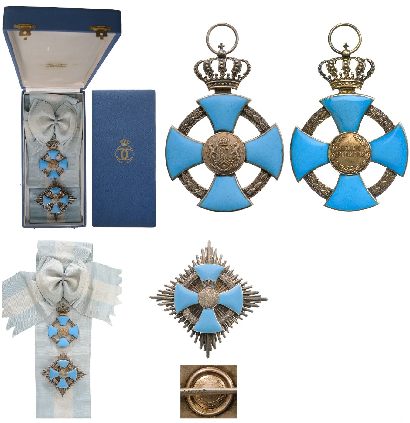 Grand Cross Set, 2nd Model, Civil, instituted in 1935. Sash Badge, 78x56 mm, gilt Silver, maker`s mark "crown-68-48-HW" concave cross, rounded light blue enamel on both sides and laurel wreaths between the limbs. The medallion on the obverse with Romanian coat of arms, the reverse medallion with the inscription Serviciu Credincios (Loyal Service), original sash. Breast Star with crown above the medallion, 55mm, gilt Silver, rhombus shaped, maker's mark "BW, Heinrich Weiss, Bucarest", hallmarked "304-36- crown", superimposed parts, enameled, on the reverse medium pin.In original case of issue by "Heinrich Weis, Bucharest, 100 Calea Victoriei" with monogram of Carol II on the lid, inner fitting missing. Extremely rare set, in very fine condition! Awarded only 35 times! I RR!