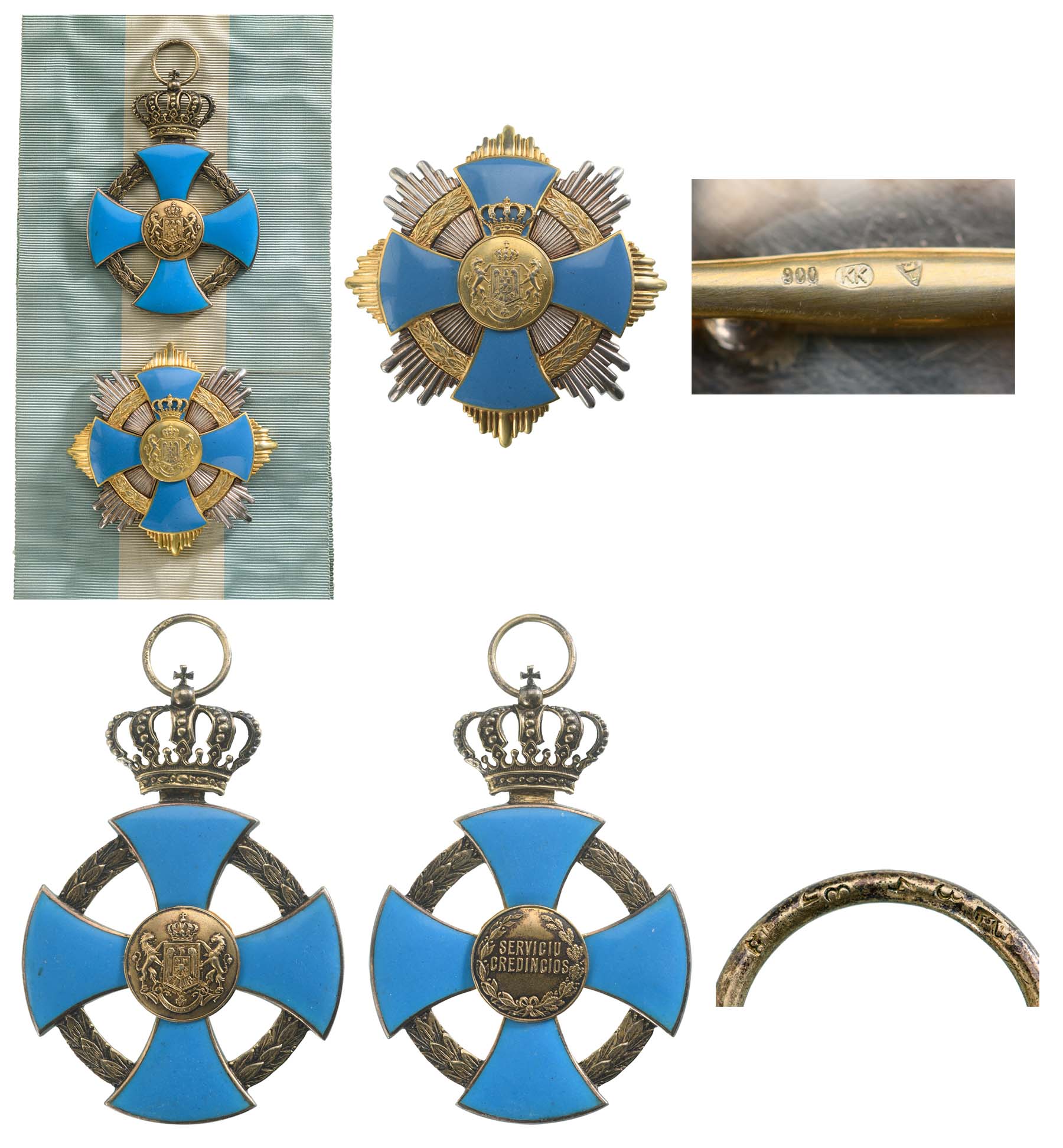 Grand Cross Set, 1st Model (1932): Sash Badge, 80x56 mm, Silver gilt, hallmarked "crown-34-81", maker`s mark "HW - Heinrich Weiss" concave cross, beautifully made slightly rounded light blue enamel on both sides and laurel wreaths between the limbs. The medallion on the obverse with Romanian coat of arms, the reverse medallion with the inscription Serviciu Credincios (Loyal Service), long sash. Breast Star with crown above the medallion, 70 mm., partially gilt Silver, enameled, hallmark "900-KK-crown", on the reverse medium pin. The order was instituted by King Carol II on April, 29th 1932. It consists of three classes (Grand Cross, Grand Officer and Commander) and it was also intended to replace the two lower grades of the Carol I Order. In 1937 the collar and officer classes were added and the order was included among war decorations (thus awarded with swords). The order has a very high position in the Romanian hierarchy of awards, being above the older national orders, the Star of Romania and the Crown of Romania. Extremely rare set, of high quality and good condition. Awarded only 25 times! I RR!