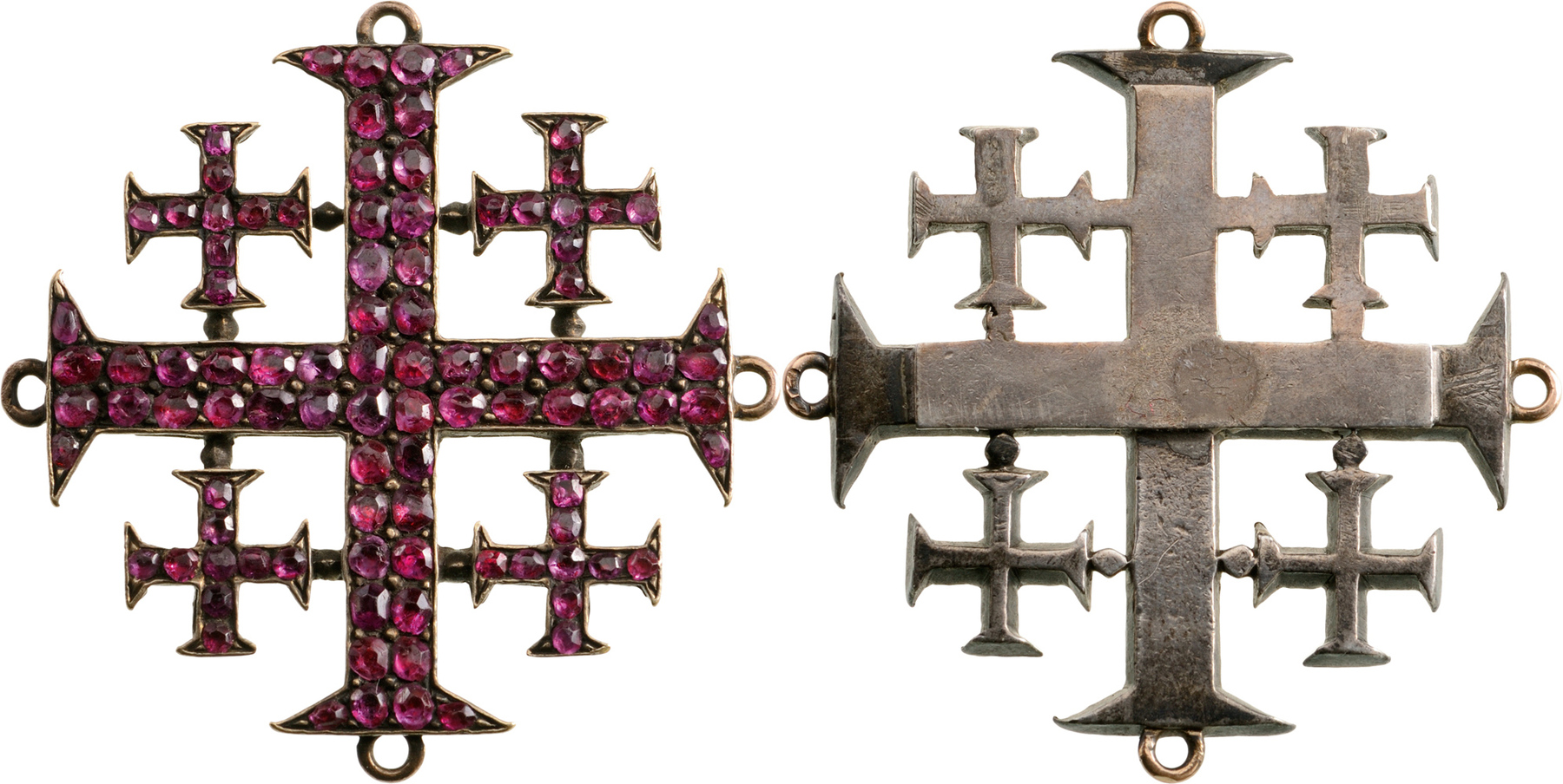 Early, Jeweled Cross of the order in Silver, instituted after 1099, 40 mm, with traces of gilding, the obverse, profusely set with rubies, four side-loops, smooth reverse.Very rare, interesting and worth of further studies. I RR!