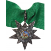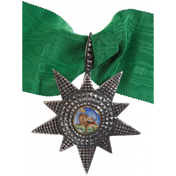 An early 1st Class Badge to be worn at the neck, 71 x 67 mm., chiseled Silver star, composed of five major rays flanked by shorter ones, centre medallion in gold with excellent enamel miniature of the Lion passant guardant, holding a scimitar, on sky-blue background with beaming, rising sun; around, triple, chiseled, round border, indicating the class, the upper ray with loop, linked to the ribbon ring, with diamond-cut chiseled details; with original, silk, neck ribbon.